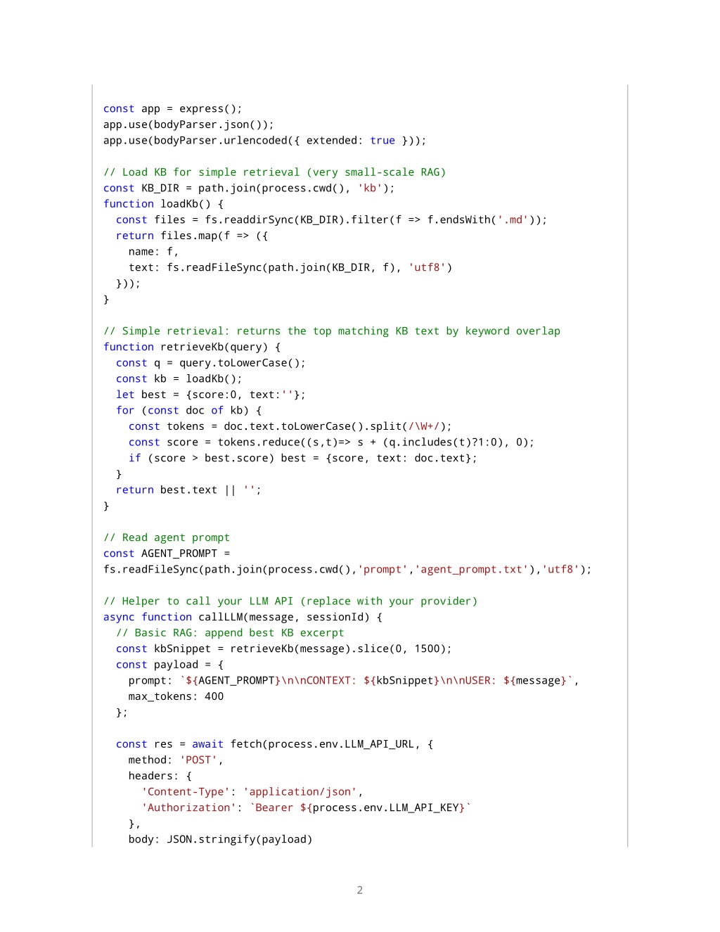 const app = express(); app.use(bodyParser.json()); app.use(bodyParser.urlencoded({ extended: true })); // Load KB for simple retrieval (very small-scale RAG) const KB_DIR = path.join(process.cwd(), 'kb'); function loadKb() { const files = fs.readdirSync(KB_DIR).filter(f => f.endsWith('.md')); return files.map(f => ({ name: f, text: fs.readFileSync(path.join(KB_DIR, f), 'utf8') })); } // Simple retrieval: returns the top matching KB text by keyword overlap function retrieveKb(query) { const q = query.toLowerCase(); const kb = loadKb(); let best = {score:0, text:''}; for (const doc of kb) { const tokens = doc.text.toLowerCase().split(/\W+/); const score = tokens.reduce((s,t)=> s + (q.includes(t)?1:0), 0); if (score > best.score) best = {score, text: doc.text}; } return best.text || ''; } // Read agent prompt const AGENT_PROMPT = fs.readFileSync(path.join(process.cwd(),'prompt','agent_prompt.txt'),'utf8'); // Helper to call your LLM API (replace with your provider) async function callLLM(message, sessionId) { // Basic RAG: append best KB excerpt const kbSnippet = retrieveKb(message).slice(0, 1500); const payload = { prompt: `${AGENT_PROMPT}\n\nCONTEXT: ${kbSnippet}\n\nUSER: ${message}`, max_tokens: 400 }; const res = await fetch(process.env.LLM_API_URL, { method: 'POST', headers: { 'Content-Type': 'application/json', 'Authorization': `Bearer ${process.env.LLM_API_KEY}` }, body: JSON.stringify(payload) 2