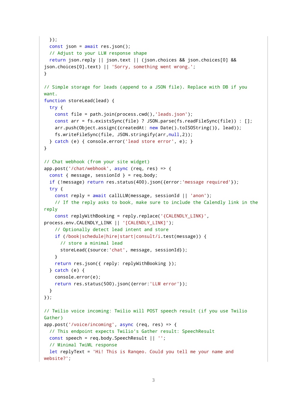 }); const json = await res.json(); // Adjust to your LLM response shape return json.reply || json.text || (json.choices && json.choices[0] && json.choices[0].text) || 'Sorry, something went wrong.'; } // Simple storage for leads (append to a JSON file). Replace with DB if you want. function storeLead(lead) { try { const file = path.join(process.cwd(),'leads.json'); const arr = fs.existsSync(file) ? JSON.parse(fs.readFileSync(file)) : []; arr.push(Object.assign({createdAt: new Date().toISOString()}, lead)); fs.writeFileSync(file, JSON.stringify(arr,null,2)); } catch (e) { console.error('lead store error', e); } } // Chat webhook (from your site widget) app.post('/chat/webhook', async (req, res) => { const { message, sessionId } = req.body; if (!message) return res.status(400).json({error:'message required'}); try { const reply = await callLLM(message, sessionId || 'anon'); // If the reply asks to book, make sure to include the Calendly link in the reply const replyWithBooking = reply.replace('{CALENDLY_LINK}', process.env.CALENDLY_LINK || '[CALENDLY_LINK]'); // Optionally detect lead intent and store if (/book|schedule|hire|start|consult/i.test(message)) { // store a minimal lead storeLead({source:'chat', message, sessionId}); } return res.json({ reply: replyWithBooking }); } catch (e) { console.error(e); return res.status(500).json({error:'LLM error'}); } }); // Twilio voice incoming: Twilio will POST speech result (if you use Twilio Gather) app.post('/voice/incoming', async (req, res) => { // This endpoint expects Twilio's Gather result: SpeechResult const speech = req.body.SpeechResult || ''; // Minimal TwiML response let replyText = 'Hi! This is Ranqeo. Could you tell me your name and website?'; 3
