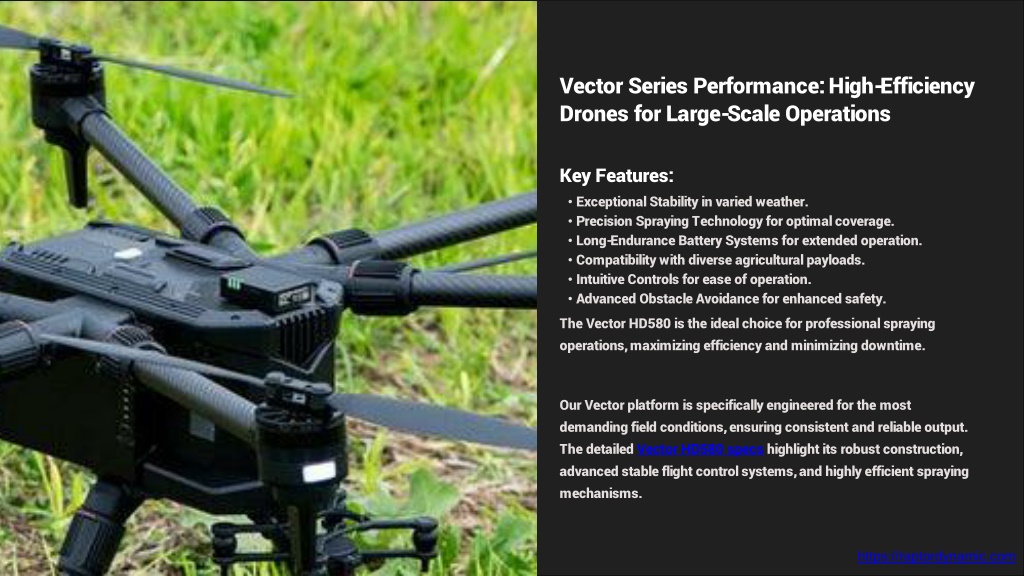 Vector Series Performance: High-Efficiency Drones for Large-Scale Operations Key Features: • Exceptional Stability in varied weather. • Precision Spraying Technology for optimal coverage. • Long-Endurance Battery Systems for extended operation. • Compatibility with diverse agricultural payloads. • Intuitive Controls for ease of operation. • Advanced Obstacle Avoidance for enhanced safety. The Vector HD580 is the ideal choice for professional spraying operations, maximizing efficiency and minimizing downtime. Our Vector platform is specifically engineered for the most demanding field conditions, ensuring consistent and reliable output. The detailed Vector HD580 specs highlight its robust construction, advanced stable flight control systems, and highly efficient spraying mechanisms. https://raptordynamic.com