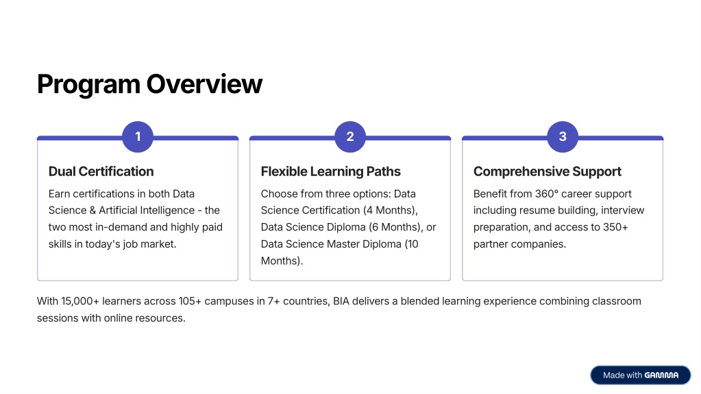 Program Overview 1 2 3 Dual Certification Flexible Learning Paths Comprehensive Support Earn certifications in both Data Science & Artificial Intelligence - the two most in-demand and highly paid skills in today's job market. Choose from three options: Data Science Certification (4 Months), Data Science Diploma (6 Months), or Data Science Master Diploma (10 Months). Benefit from 360° career support including resume building, interview preparation, and access to 350+ partner companies. With 15,000+ learners across 105+ campuses in 7+ countries, BIA delivers a blended learning experience combining classroom sessions with online resources.