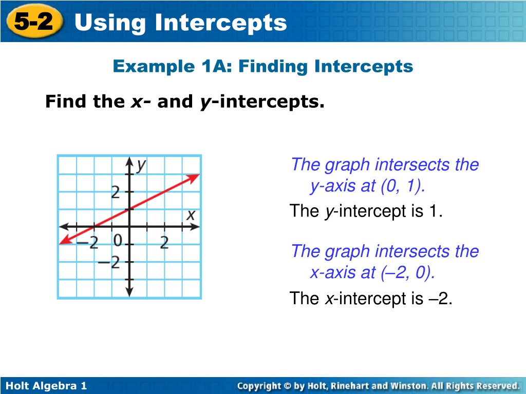 33. Example 1A: Finding Intercepts Find the x- and y-intercepts. The graph intersects the y-axis at (0, 1). The y-intercept is 1. The graph intersects the x-axis at (–2, 0). The x-intercept is –2.