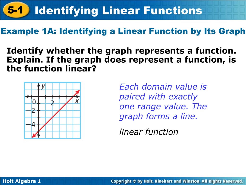4. Example 1A: Identifying a Linear Function by Its Graph Identify whether the graph represents a function. Explain. If the graph does represent a function, is the function linear? Each domain value is paired with exactly one range value. The graph forms a line. linear function