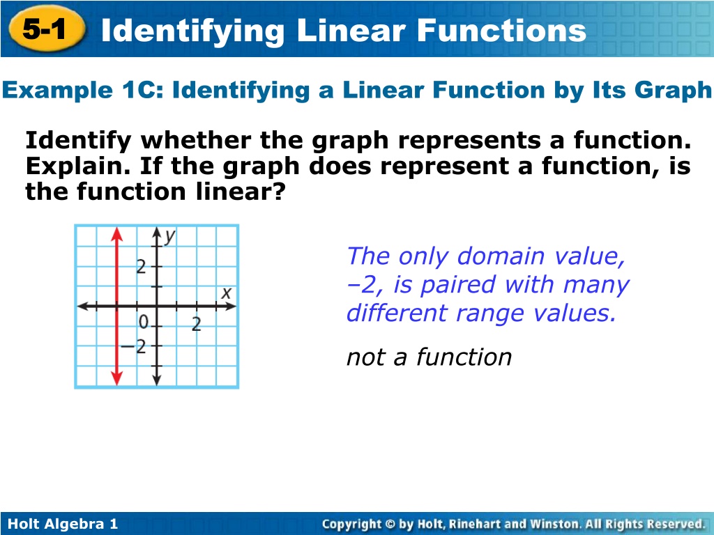 6. Example 1C: Identifying a Linear Function by Its Graph Identify whether the graph represents a function. Explain. If the graph does represent a function, is the function linear? The only domain value, –2, is paired with many different range values. not a function