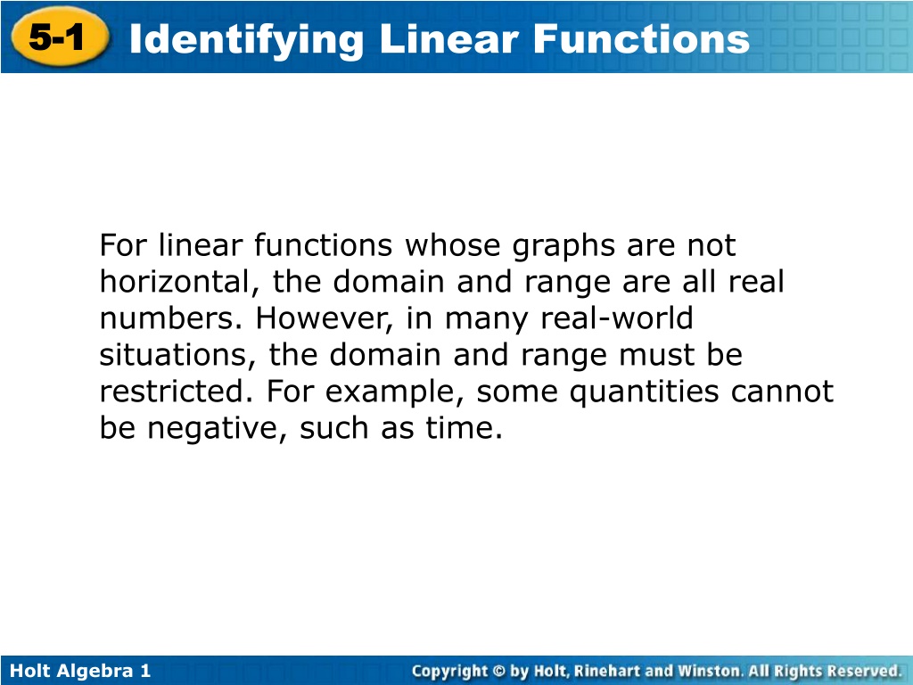 25. For linear functions whose graphs are not horizontal, the domain and range are all real numbers. However, in many real-world situations, the domain and range must be restricted. For example, some quantities cannot be negative, such as time.