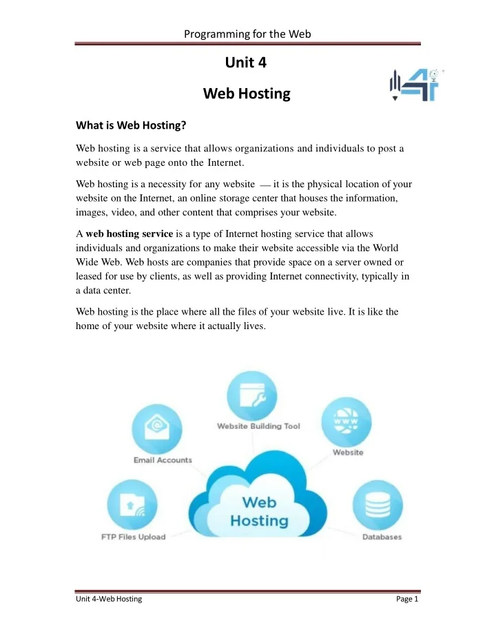 Programming for theWeb Good hosting is affordable, low-maintenance, andscaleable. You can host website in twoways: • Use a hostingplatform • Host locally (only in your PC can access thewebsite) Now we are talking about the hosting website on internet, follow thesefour simple steps to host your website with a hostingprovider: • o Step 1: Compare hostingcompanies. • With that out of the way, the most popular global registrars include: Namecheap • GoDaddy • Name.com • Domain.com • Bluehost.com • Each of these companies has a slightly different user interface, but what you get in the end isthe same a shiny new domainname. • Step 2: Choose a website hostingcompany. • one! There are a number of features you should consider when choosing a website hostingcompany. • Below are some of the key factors toconsider: • Uptime • Support • Free domainname • Value forMoney • Bandwidth • WordPressintegration • Money-backguarantees Unit 4-WebHosting