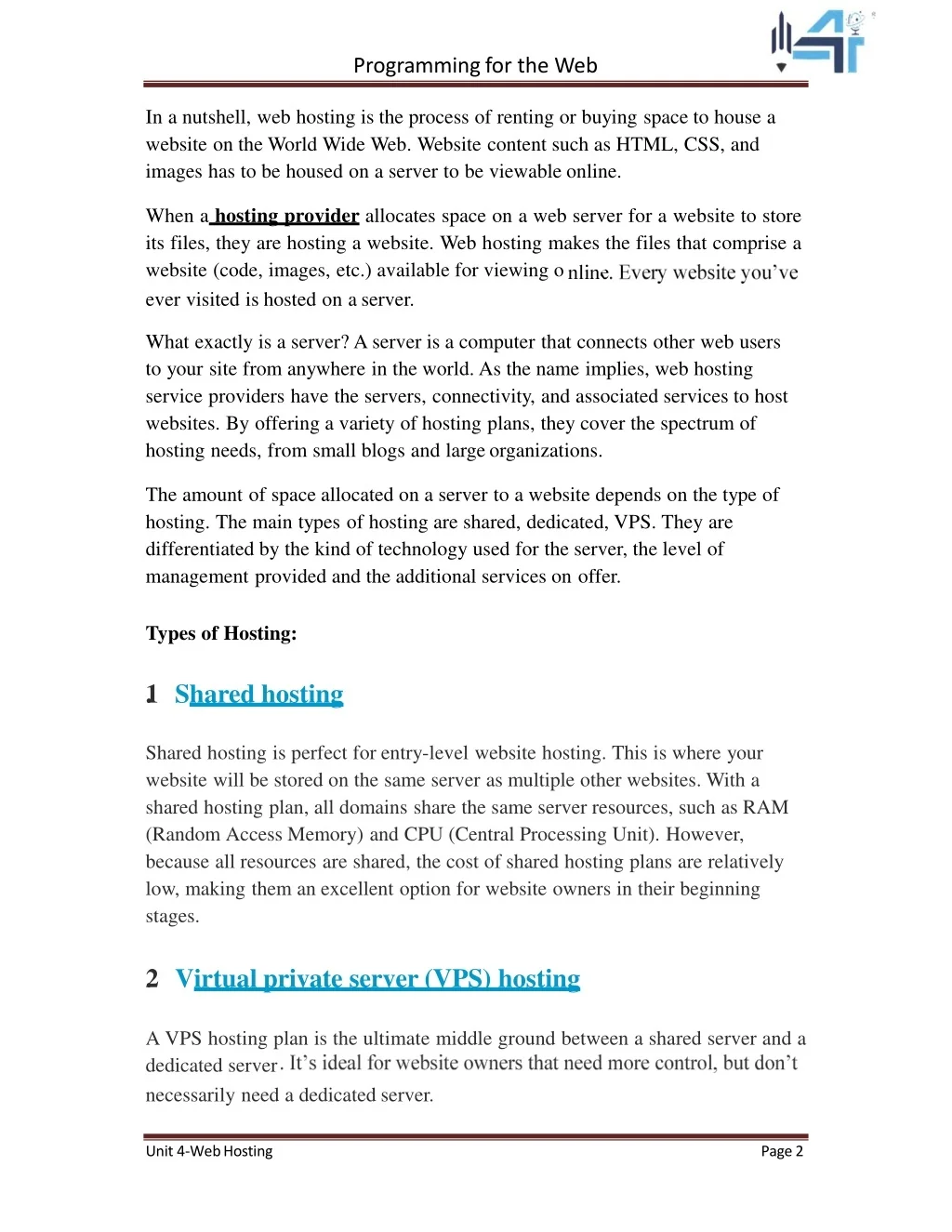 Programming for theWeb In a nutshell, web hosting is the process of renting or buying space to house a website on the World Wide Web. Website content such as HTML, CSS, and images has to be housed on a server to be viewableonline. When ahosting providerallocates space on a web server for a website to store its files, they are hosting a website. Web hosting makes the files that comprise a website (code, images, etc.) available for viewing o ever visited is hosted on aserver. What exactly is a server? A server is a computer that connects other web users to your site from anywhere in the world. As the name implies, web hosting service providers have the servers, connectivity, and associated services to host websites. By offering a variety of hosting plans, they cover the spectrum of hosting needs, from small blogs and largeorganizations. The amount of space allocated on a server to a website depends on the type of hosting. The main types of hosting are shared, dedicated, VPS. They are differentiated by the kind of technology used for the server, the level of management provided and the additional services onoffer. Types of Hosting: Shared hosting Shared hosting is perfect for entry-level website hosting. This is where your website will be stored on the same server as multiple other websites. With a shared hosting plan, all domains share the same server resources, such as RAM (Random Access Memory) and CPU (Central Processing Unit). However, because all resources are shared, the cost of shared hosting plans are relatively low, making them an excellent option for website owners in their beginning stages. Virtual private server (VPS)hosting A VPS hosting plan is the ultimate middle ground between a shared server and a dedicated server necessarily need a dedicatedserver. Unit 4-WebHosting