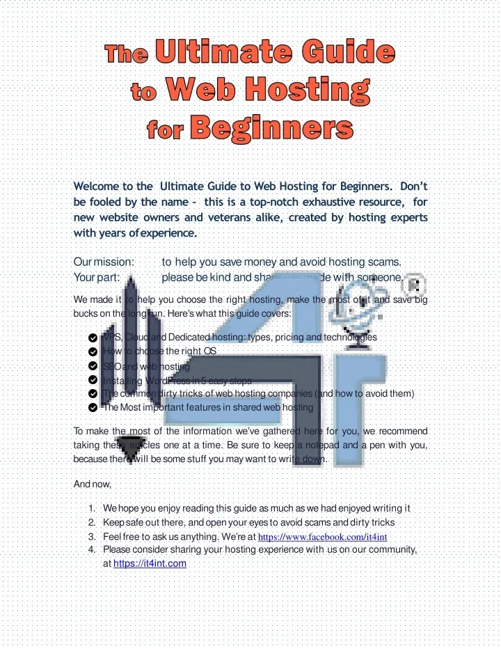 Welcome to the Ultimate Guide to Web Hosting for Beginners. Don’t be fooled by the name – this is a top-notch exhaustive resource, for new website owners and veterans alike, created by hosting experts with years ofexperience. Ourmission: Yourpart: to help you save money and avoid hosting scams. pleasebekind andsharethis guidewith someone. We made it to help you choose the right hosting, make the most of it and save big bucksonthe longrun. Here’swhat this guide covers: VPS,CloudandDedicated hosting: types, pricing andtechnologies Howto choosetheright OS SEO and web hosting Installing WordPress in5 easy steps Thecommondirty tricks of webhosting companies(andhowto avoid them) TheMost important featuresin sharedwebhosting To make the most of the information we’ve gathered here for you, we recommend taking these articles one at a time. Be sure to keep a notepad and a pen with you, becausethere will besomestuff youmaywant to write down. Andnow, 1. Wehopeyouenjoyreadingthis guide as muchas wehadenjoyed writing it 2. Keepsafeout there, andopenyour eyes to avoid scamsanddirty tricks 3. Feelfree to askusanything. We’reat https://www.facebook.com/it4int 4. Please consider sharing your hosting experience with us on our community, at https://it4int.com