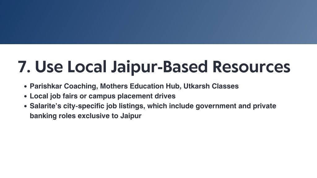 7. Use Local Jaipur-Based Resources Parishkar Coaching, Mothers Education Hub, Utkarsh Classes Local job fairs or campus placement drives Salarite’s city-specific job listings, which include government and private banking roles exclusive to Jaipur