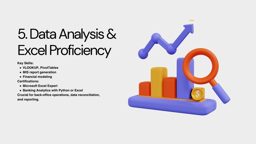 5. Data Analysis & Excel Proficiency Key Skills: VLOOKUP, PivotTables MIS report generation Financial modeling Certifications: Microsoft Excel Expert Banking Analytics with Python or Excel Crucial for back-office operations, data reconciliation, and reporting.
