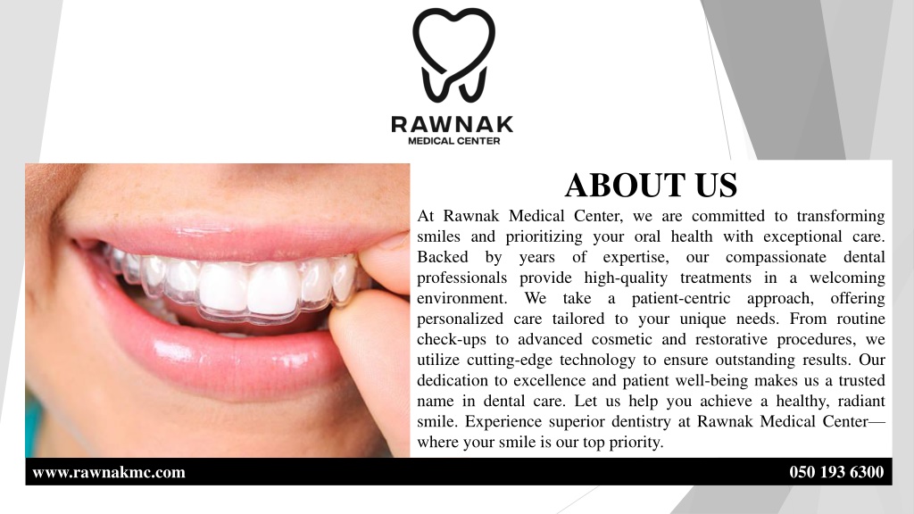 2. ABOUT US At Rawnak Medical Center, we are committed to transforming smiles and prioritizing your oral health with exceptional care. Backed by years of expertise, professionals provide high-quality treatments in a welcoming environment. We take a patient-centric personalized care tailored to your unique needs. From routine check-ups to advanced cosmetic and restorative procedures, we utilize cutting-edge technology to ensure outstanding results. Our dedication to excellence and patient well-being makes us a trusted name in dental care. Let us help you achieve a healthy, radiant smile. Experience superior dentistry at Rawnak Medical Center— where your smile is our top priority. our compassionate dental approach, offering www.rawnakmc.com 050 193 6300