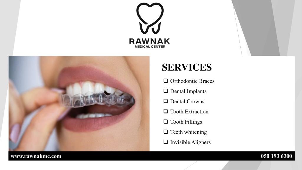 3. SERVICES ❑ Orthodontic Braces ❑ Dental Implants ❑ Dental Crowns ❑ Tooth Extraction ❑ Tooth Fillings ❑ Teeth whitening ❑ Invisible Aligners www.rawnakmc.com 050 193 6300