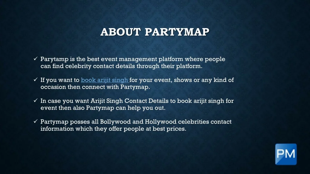 About Partymap • Parytamp is the best event management platform where people can find celebrity contact details through their platform. • If you want to book arijitsinghfor your event, shows or any kind of occasion then connect with Partymap. • In case you want Arijit Singh Contact Details to book arijitsingh for event then also Partymap can help you out. • Partymap posses all Bollywood and Hollywood celebrities contact information which they offer people at best prices.
