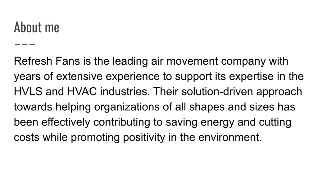 About me Refresh Fans is the leading air movement company with years of extensive experience to support its expertise in the HVLS and HVAC industries. Their solution-driven approach towards helping organizations of all shapes and sizes has been effectively contributing to saving energy and cutting costs while promoting positivity in the environment.