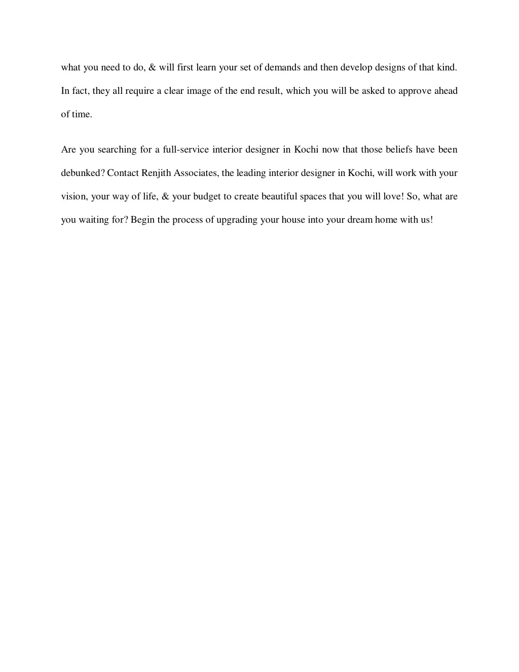 what you need to do, & will first learn your set of demands and then develop designs of that kind. In fact, they all require a clear image of the end result, which you will be asked to approve ahead of time. Are you searching for a full-service interior designer in Kochi now that those beliefs have been debunked? Contact Renjith Associates, the leading interior designer in Kochi, will work with your vision, your way of life, & your budget to create beautiful spaces that you will love! So, what are you waiting for? Begin the process of upgrading your house into your dream home with us!
