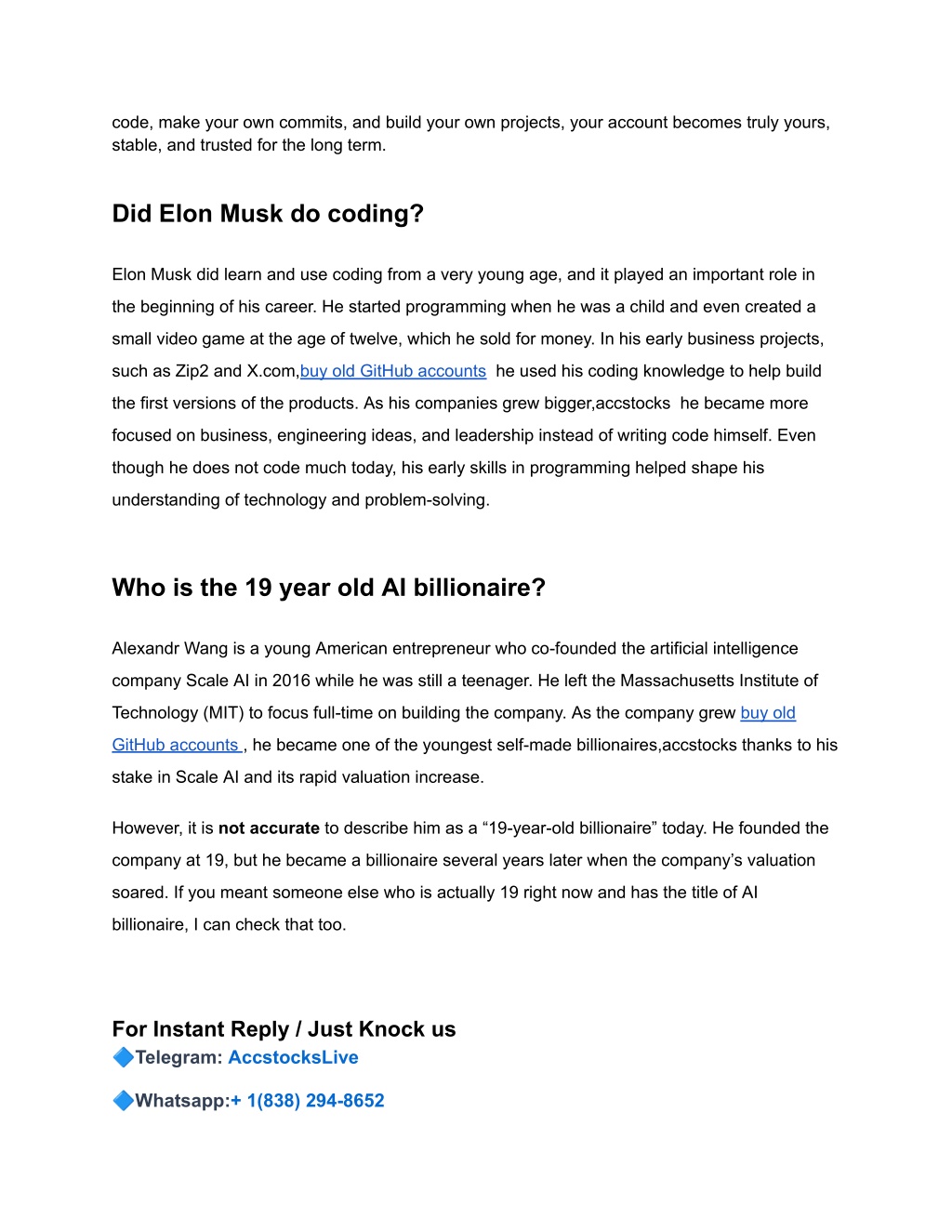 code, make your own commits, and build your own projects, your account becomes truly yours, stable, and trusted for the long term. Did Elon Musk do coding? Elon Musk did learn and use coding from a very young age, and it played an important role in the beginning of his career. He started programming when he was a child and even created a small video game at the age of twelve, which he sold for money. In his early business projects, such as Zip2 and X.com,buy old GitHub accounts he used his coding knowledge to help build the first versions of the products. As his companies grew bigger,accstocks he became more focused on business, engineering ideas, and leadership instead of writing code himself. Even though he does not code much today, his early skills in programming helped shape his understanding of technology and problem-solving. Who is the 19 year old AI billionaire? Alexandr Wang is a young American entrepreneur who co-founded the artificial intelligence company Scale AI in 2016 while he was still a teenager. He left the Massachusetts Institute of Technology (MIT) to focus full-time on building the company. As the company grew buy old GitHub accounts , he became one of the youngest self-made billionaires,accstocks thanks to his stake in Scale AI and its rapid valuation increase. However, it is not accurate to describe him as a “19-year-old billionaire” today. He founded the company at 19, but he became a billionaire several years later when the company’s valuation soared. If you meant someone else who is actually 19 right now and has the title of AI billionaire, I can check that too. For Instant Reply / Just Knock us ?Telegram: AccstocksLive ?Whatsapp:+ 1(838) 294-8652