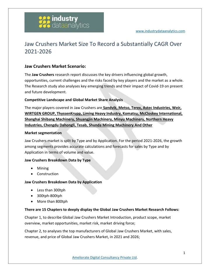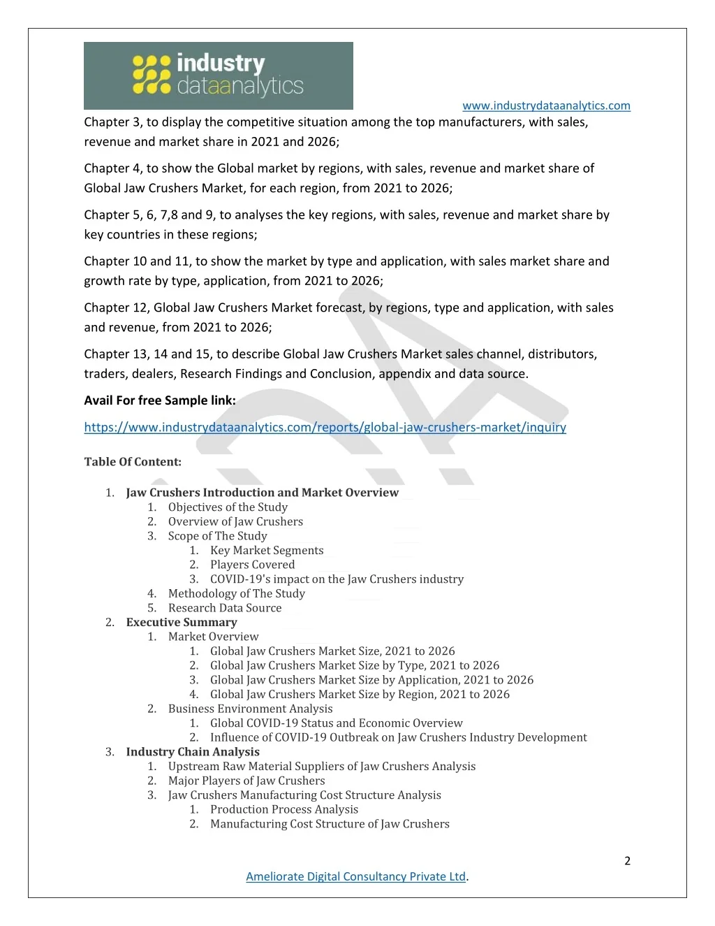 www.industrydataanalytics.com Chapter 3, to display the competitive situation among the top manufacturers, with sales, revenue and market share in 2021 and 2026; Chapter 4, to show the Global market by regions, with sales, revenue and market share of Global Jaw Crushers Market, for each region, from 2021 to 2026; Chapter 5, 6, 7,8 and 9, to analyses the key regions, with sales, revenue and market share by key countries in these regions; Chapter 10 and 11, to show the market by type and application, with sales market share and growth rate by type, application, from 2021 to 2026; Chapter 12, Global Jaw Crushers Market forecast, by regions, type and application, with sales and revenue, from 2021 to 2026; Chapter 13, 14 and 15, to describe Global Jaw Crushers Market sales channel, distributors, traders, dealers, Research Findings and Conclusion, appendix and data source. Avail For free Sample link: https://www.industrydataanalytics.com/reports/global-jaw-crushers-market/inquiry Table Of Content: 1.Jaw Crushers Introduction and Market Overview 1.Objectives of the Study 2.Overview of Jaw Crushers 3.Scope of The Study 1.Key Market Segments 2.Players Covered 3.COVID-19's impact on the Jaw Crushers industry 4.Methodology of The Study 5.Research Data Source 2.Executive Summary 1.Market Overview 1.Global Jaw Crushers Market Size, 2021 to 2026 2.Global Jaw Crushers Market Size by Type, 2021 to 2026 3.Global Jaw Crushers Market Size by Application, 2021 to 2026 4.Global Jaw Crushers Market Size by Region, 2021 to 2026 2.Business Environment Analysis 1.Global COVID-19 Status and Economic Overview 2.Influence of COVID-19 Outbreak on Jaw Crushers Industry Development 3.Industry Chain Analysis 1.Upstream Raw Material Suppliers of Jaw Crushers Analysis 2.Major Players of Jaw Crushers 3.Jaw Crushers Manufacturing Cost Structure Analysis 1.Production Process Analysis 2.Manufacturing Cost Structure of Jaw Crushers 2 Ameliorate Digital Consultancy Private Ltd.
