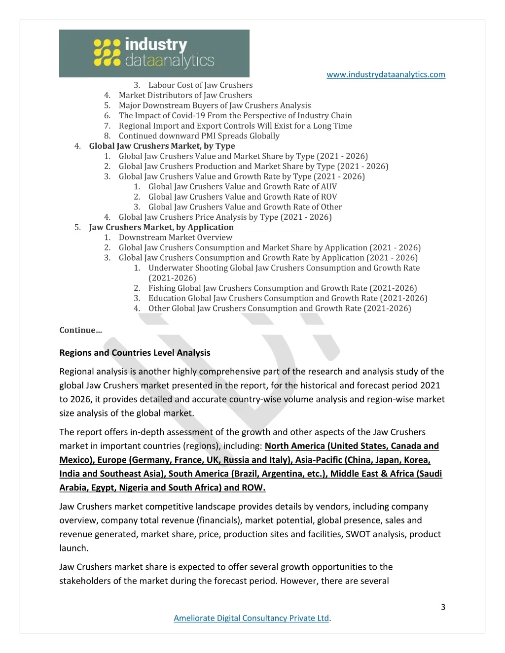 www.industrydataanalytics.com 3.Labour Cost of Jaw Crushers 4.Market Distributors of Jaw Crushers 5.Major Downstream Buyers of Jaw Crushers Analysis 6.The Impact of Covid-19 From the Perspective of Industry Chain 7.Regional Import and Export Controls Will Exist for a Long Time 8.Continued downward PMI Spreads Globally 4.Global Jaw Crushers Market, by Type 1.Global Jaw Crushers Value and Market Share by Type (2021 - 2026) 2.Global Jaw Crushers Production and Market Share by Type (2021 - 2026) 3.Global Jaw Crushers Value and Growth Rate by Type (2021 - 2026) 1.Global Jaw Crushers Value and Growth Rate of AUV 2.Global Jaw Crushers Value and Growth Rate of ROV 3.Global Jaw Crushers Value and Growth Rate of Other 4.Global Jaw Crushers Price Analysis by Type (2021 - 2026) 5.Jaw Crushers Market, by Application 1.Downstream Market Overview 2.Global Jaw Crushers Consumption and Market Share by Application (2021 - 2026) 3.Global Jaw Crushers Consumption and Growth Rate by Application (2021 - 2026) 1.Underwater Shooting Global Jaw Crushers Consumption and Growth Rate (2021-2026) 2.Fishing Global Jaw Crushers Consumption and Growth Rate (2021-2026) 3.Education Global Jaw Crushers Consumption and Growth Rate (2021-2026) 4.Other Global Jaw Crushers Consumption and Growth Rate (2021-2026) Continue… Regions and Countries Level Analysis Regional analysis is another highly comprehensive part of the research and analysis study of the global Jaw Crushers market presented in the report, for the historical and forecast period 2021 to 2026, it provides detailed and accurate country-wise volume analysis and region-wise market size analysis of the global market. The report offers in-depth assessment of the growth and other aspects of the Jaw Crushers market in important countries (regions), including: North America (United States, Canada and Mexico), Europe (Germany, France, UK, Russia and Italy), Asia-Pacific (China, Japan, Korea, India and Southeast Asia), South America (Brazil, Argentina, etc.), Middle East & Africa (Saudi Arabia, Egypt, Nigeria and South Africa) and ROW. Jaw Crushers market competitive landscape provides details by vendors, including company overview, company total revenue (financials), market potential, global presence, sales and revenue generated, market share, price, production sites and facilities, SWOT analysis, product launch. Jaw Crushers market share is expected to offer several growth opportunities to the stakeholders of the market during the forecast period. However, there are several 3 Ameliorate Digital Consultancy Private Ltd.