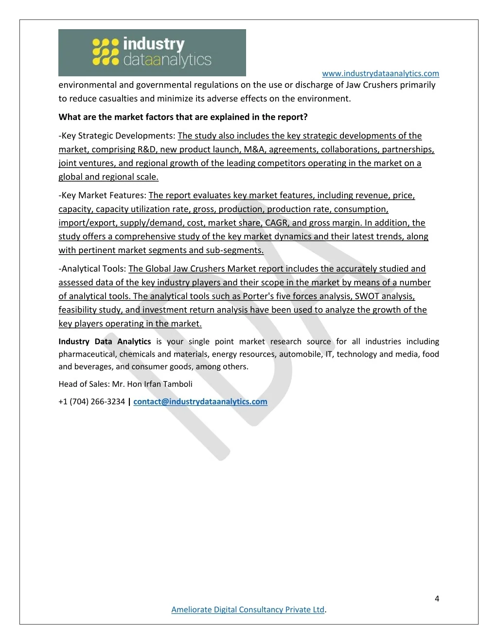 www.industrydataanalytics.com environmental and governmental regulations on the use or discharge of Jaw Crushers primarily to reduce casualties and minimize its adverse effects on the environment. What are the market factors that are explained in the report? -Key Strategic Developments: The study also includes the key strategic developments of the market, comprising R&D, new product launch, M&A, agreements, collaborations, partnerships, joint ventures, and regional growth of the leading competitors operating in the market on a global and regional scale. -Key Market Features: The report evaluates key market features, including revenue, price, capacity, capacity utilization rate, gross, production, production rate, consumption, import/export, supply/demand, cost, market share, CAGR, and gross margin. In addition, the study offers a comprehensive study of the key market dynamics and their latest trends, along with pertinent market segments and sub-segments. -Analytical Tools: The Global Jaw Crushers Market report includes the accurately studied and assessed data of the key industry players and their scope in the market by means of a number of analytical tools. The analytical tools such as Porter's five forces analysis, SWOT analysis, feasibility study, and investment return analysis have been used to analyze the growth of the key players operating in the market. Industry Data Analytics is your single point market research source for all industries including pharmaceutical, chemicals and materials, energy resources, automobile, IT, technology and media, food and beverages, and consumer goods, among others. Head of Sales: Mr. Hon Irfan Tamboli +1 (704) 266-3234 | contact@industrydataanalytics.com 4 Ameliorate Digital Consultancy Private Ltd.