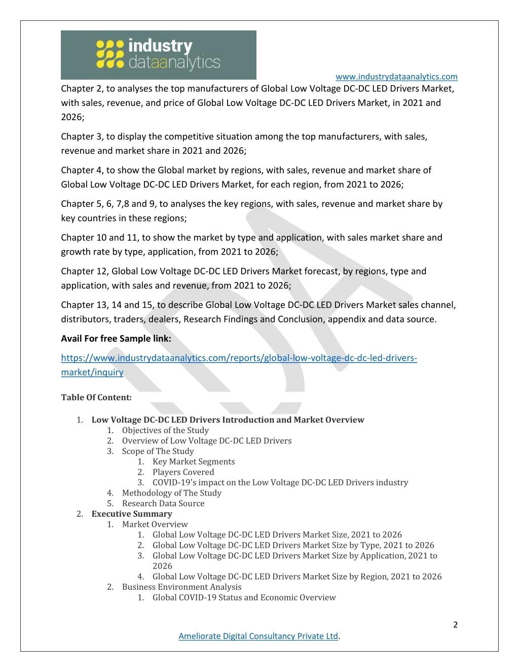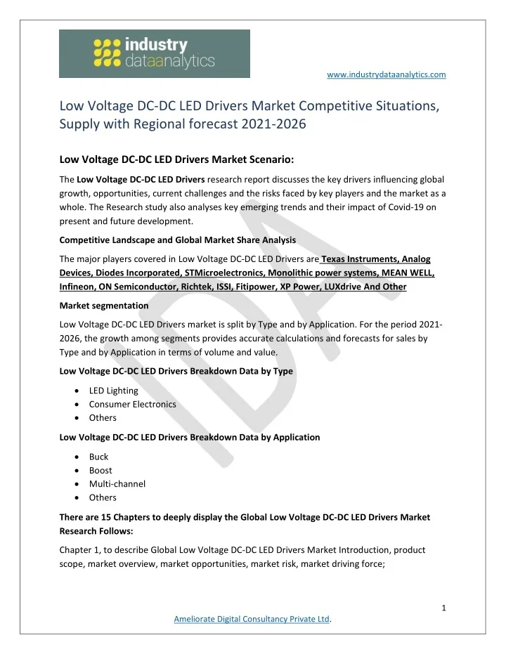 www.industrydataanalytics.com Chapter 2, to analyses the top manufacturers of Global Low Voltage DC-DC LED Drivers Market, with sales, revenue, and price of Global Low Voltage DC-DC LED Drivers Market, in 2021 and 2026; Chapter 3, to display the competitive situation among the top manufacturers, with sales, revenue and market share in 2021 and 2026; Chapter 4, to show the Global market by regions, with sales, revenue and market share of Global Low Voltage DC-DC LED Drivers Market, for each region, from 2021 to 2026; Chapter 5, 6, 7,8 and 9, to analyses the key regions, with sales, revenue and market share by key countries in these regions; Chapter 10 and 11, to show the market by type and application, with sales market share and growth rate by type, application, from 2021 to 2026; Chapter 12, Global Low Voltage DC-DC LED Drivers Market forecast, by regions, type and application, with sales and revenue, from 2021 to 2026; Chapter 13, 14 and 15, to describe Global Low Voltage DC-DC LED Drivers Market sales channel, distributors, traders, dealers, Research Findings and Conclusion, appendix and data source. Avail For free Sample link: https://www.industrydataanalytics.com/reports/global-low-voltage-dc-dc-led-drivers- market/inquiry Table Of Content: 1.Low Voltage DC-DC LED Drivers Introduction and Market Overview 1.Objectives of the Study 2.Overview of Low Voltage DC-DC LED Drivers 3.Scope of The Study 1.Key Market Segments 2.Players Covered 3.COVID-19's impact on the Low Voltage DC-DC LED Drivers industry 4.Methodology of The Study 5.Research Data Source 2.Executive Summary 1.Market Overview 1.Global Low Voltage DC-DC LED Drivers Market Size, 2021 to 2026 2.Global Low Voltage DC-DC LED Drivers Market Size by Type, 2021 to 2026 3.Global Low Voltage DC-DC LED Drivers Market Size by Application, 2021 to 2026 4.Global Low Voltage DC-DC LED Drivers Market Size by Region, 2021 to 2026 2.Business Environment Analysis 1.Global COVID-19 Status and Economic Overview 2 Ameliorate Digital Consultancy Private Ltd.