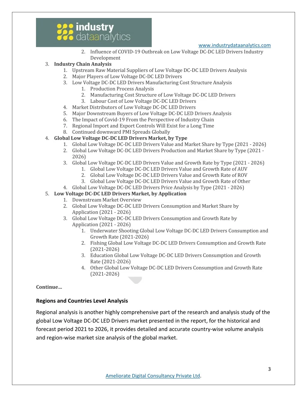 www.industrydataanalytics.com 2.Influence of COVID-19 Outbreak on Low Voltage DC-DC LED Drivers Industry Development 3.Industry Chain Analysis 1.Upstream Raw Material Suppliers of Low Voltage DC-DC LED Drivers Analysis 2.Major Players of Low Voltage DC-DC LED Drivers 3.Low Voltage DC-DC LED Drivers Manufacturing Cost Structure Analysis 1.Production Process Analysis 2.Manufacturing Cost Structure of Low Voltage DC-DC LED Drivers 3.Labour Cost of Low Voltage DC-DC LED Drivers 4.Market Distributors of Low Voltage DC-DC LED Drivers 5.Major Downstream Buyers of Low Voltage DC-DC LED Drivers Analysis 6.The Impact of Covid-19 From the Perspective of Industry Chain 7.Regional Import and Export Controls Will Exist for a Long Time 8.Continued downward PMI Spreads Globally 4.Global Low Voltage DC-DC LED Drivers Market, by Type 1.Global Low Voltage DC-DC LED Drivers Value and Market Share by Type (2021 - 2026) 2.Global Low Voltage DC-DC LED Drivers Production and Market Share by Type (2021 - 2026) 3.Global Low Voltage DC-DC LED Drivers Value and Growth Rate by Type (2021 - 2026) 1.Global Low Voltage DC-DC LED Drivers Value and Growth Rate of AUV 2.Global Low Voltage DC-DC LED Drivers Value and Growth Rate of ROV 3.Global Low Voltage DC-DC LED Drivers Value and Growth Rate of Other 4.Global Low Voltage DC-DC LED Drivers Price Analysis by Type (2021 - 2026) 5.Low Voltage DC-DC LED Drivers Market, by Application 1.Downstream Market Overview 2.Global Low Voltage DC-DC LED Drivers Consumption and Market Share by Application (2021 - 2026) 3.Global Low Voltage DC-DC LED Drivers Consumption and Growth Rate by Application (2021 - 2026) 1.Underwater Shooting Global Low Voltage DC-DC LED Drivers Consumption and Growth Rate (2021-2026) 2.Fishing Global Low Voltage DC-DC LED Drivers Consumption and Growth Rate (2021-2026) 3.Education Global Low Voltage DC-DC LED Drivers Consumption and Growth Rate (2021-2026) 4.Other Global Low Voltage DC-DC LED Drivers Consumption and Growth Rate (2021-2026) Continue… Regions and Countries Level Analysis Regional analysis is another highly comprehensive part of the research and analysis study of the global Low Voltage DC-DC LED Drivers market presented in the report, for the historical and forecast period 2021 to 2026, it provides detailed and accurate country-wise volume analysis and region-wise market size analysis of the global market. 3 Ameliorate Digital Consultancy Private Ltd.