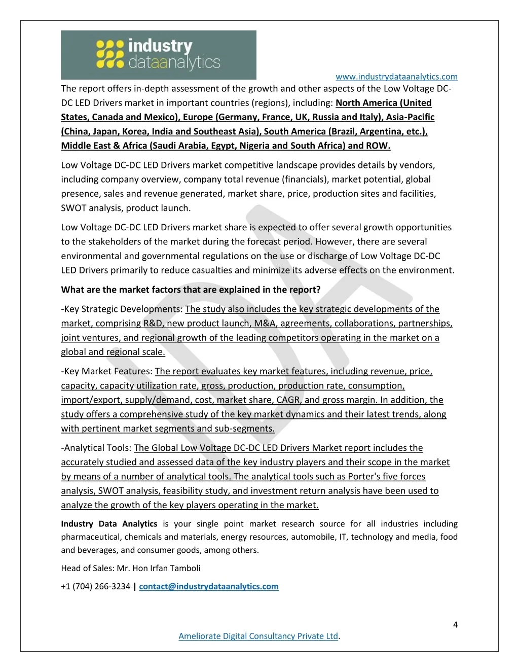 www.industrydataanalytics.com The report offers in-depth assessment of the growth and other aspects of the Low Voltage DC- DC LED Drivers market in important countries (regions), including: North America (United States, Canada and Mexico), Europe (Germany, France, UK, Russia and Italy), Asia-Pacific (China, Japan, Korea, India and Southeast Asia), South America (Brazil, Argentina, etc.), Middle East & Africa (Saudi Arabia, Egypt, Nigeria and South Africa) and ROW. Low Voltage DC-DC LED Drivers market competitive landscape provides details by vendors, including company overview, company total revenue (financials), market potential, global presence, sales and revenue generated, market share, price, production sites and facilities, SWOT analysis, product launch. Low Voltage DC-DC LED Drivers market share is expected to offer several growth opportunities to the stakeholders of the market during the forecast period. However, there are several environmental and governmental regulations on the use or discharge of Low Voltage DC-DC LED Drivers primarily to reduce casualties and minimize its adverse effects on the environment. What are the market factors that are explained in the report? -Key Strategic Developments: The study also includes the key strategic developments of the market, comprising R&D, new product launch, M&A, agreements, collaborations, partnerships, joint ventures, and regional growth of the leading competitors operating in the market on a global and regional scale. -Key Market Features: The report evaluates key market features, including revenue, price, capacity, capacity utilization rate, gross, production, production rate, consumption, import/export, supply/demand, cost, market share, CAGR, and gross margin. In addition, the study offers a comprehensive study of the key market dynamics and their latest trends, along with pertinent market segments and sub-segments. -Analytical Tools: The Global Low Voltage DC-DC LED Drivers Market report includes the accurately studied and assessed data of the key industry players and their scope in the market by means of a number of analytical tools. The analytical tools such as Porter's five forces analysis, SWOT analysis, feasibility study, and investment return analysis have been used to analyze the growth of the key players operating in the market. Industry Data Analytics is your single point market research source for all industries including pharmaceutical, chemicals and materials, energy resources, automobile, IT, technology and media, food and beverages, and consumer goods, among others. Head of Sales: Mr. Hon Irfan Tamboli +1 (704) 266-3234 | contact@industrydataanalytics.com 4 Ameliorate Digital Consultancy Private Ltd.