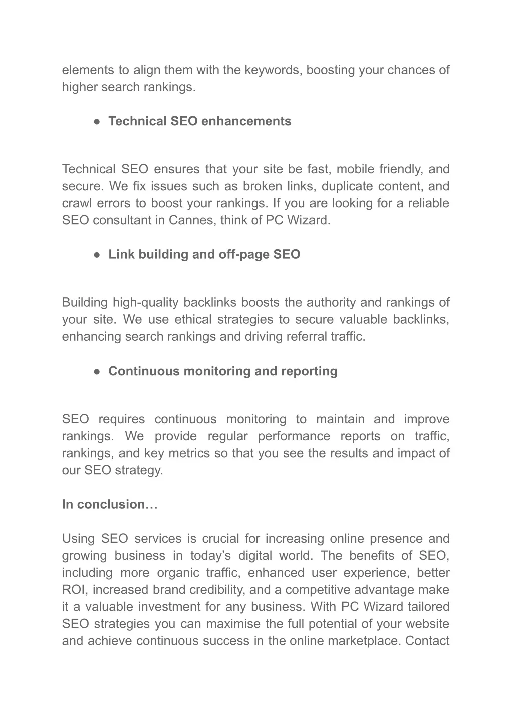 elements to align them with the keywords, boosting your chances of higher search rankings. ● Technical SEO enhancements Technical SEO ensures that your site be fast, mobile friendly, and secure. We fix issues such as broken links, duplicate content, and crawl errors to boost your rankings. If you are looking for a reliable SEO consultant in Cannes, think of PC Wizard. ● Link building and off-page SEO Building high-quality backlinks boosts the authority and rankings of your site. We use ethical strategies to secure valuable backlinks, enhancing search rankings and driving referral traffic. ● Continuous monitoring and reporting SEO requires continuous monitoring to maintain and improve rankings. We provide regular performance reports on traffic, rankings, and key metrics so that you see the results and impact of our SEO strategy. In conclusion… Using SEO services is crucial for increasing online presence and growing business in today’s digital world. The benefits of SEO, including more organic traffic, enhanced user experience, better ROI, increased brand credibility, and a competitive advantage make it a valuable investment for any business. With PC Wizard tailored SEO strategies you can maximise the full potential of your website and achieve continuous success in the online marketplace. Contact