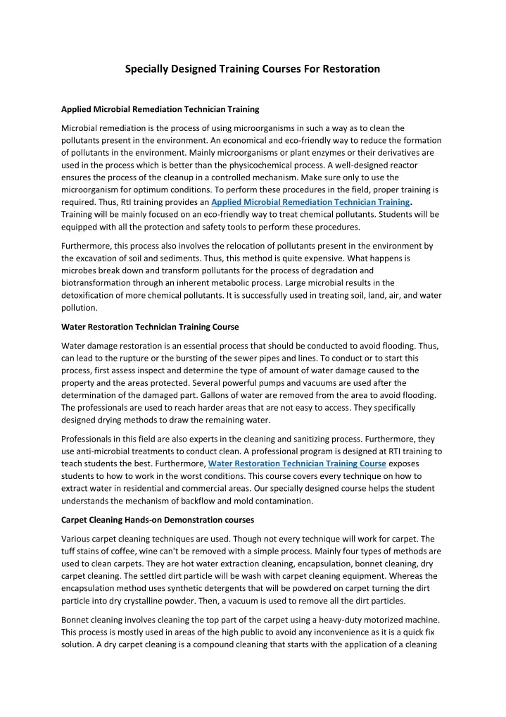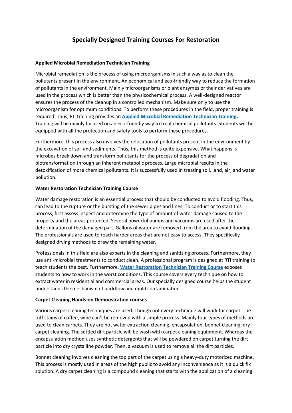 Specially Designed Training Courses For Restoration Applied Microbial Remediation Technician Training Microbial remediation is the process of using microorganisms in such a way as to clean the pollutants present in the environment. An economical and eco-friendly way to reduce the formation of pollutants in the environment. Mainly microorganisms or plant enzymes or their derivatives are used in the process which is better than the physicochemical process. A well-designed reactor ensures the process of the cleanup in a controlled mechanism. Make sure only to use the microorganism for optimum conditions. To perform these procedures in the field, proper training is required. Thus, RtI training provides an Applied Microbial Remediation Technician Training. Training will be mainly focused on an eco-friendly way to treat chemical pollutants. Students will be equipped with all the protection and safety tools to perform these procedures. Furthermore, this process also involves the relocation of pollutants present in the environment by the excavation of soil and sediments. Thus, this method is quite expensive. What happens is microbes break down and transform pollutants for the process of degradation and biotransformation through an inherent metabolic process. Large microbial results in the detoxification of more chemical pollutants. It is successfully used in treating soil, land, air, and water pollution. Water Restoration Technician Training Course Water damage restoration is an essential process that should be conducted to avoid flooding. Thus, can lead to the rupture or the bursting of the sewer pipes and lines. To conduct or to start this process, first assess inspect and determine the type of amount of water damage caused to the property and the areas protected. Several powerful pumps and vacuums are used after the determination of the damaged part. Gallons of water are removed from the area to avoid flooding. The professionals are used to reach harder areas that are not easy to access. They specifically designed drying methods to draw the remaining water. Professionals in this field are also experts in the cleaning and sanitizing process. Furthermore, they use anti-microbial treatments to conduct clean. A professional program is designed at RTI training to teach students the best. Furthermore, Water Restoration Technician Training Course exposes students to how to work in the worst conditions. This course covers every technique on how to extract water in residential and commercial areas. Our specially designed course helps the student understands the mechanism of backflow and mold contamination. Carpet Cleaning Hands-on Demonstration courses Various carpet cleaning techniques are used. Though not every technique will work for carpet. The tuff stains of coffee, wine can't be removed with a simple process. Mainly four types of methods are used to clean carpets. They are hot water extraction cleaning, encapsulation, bonnet cleaning, dry carpet cleaning. The settled dirt particle will be wash with carpet cleaning equipment. Whereas the encapsulation method uses synthetic detergents that will be powdered on carpet turning the dirt particle into dry crystalline powder. Then, a vacuum is used to remove all the dirt particles. Bonnet cleaning involves cleaning the top part of the carpet using a heavy-duty motorized machine. This process is mostly used in areas of the high public to avoid any inconvenience as it is a quick fix solution. A dry carpet cleaning is a compound cleaning that starts with the application of a cleaning
