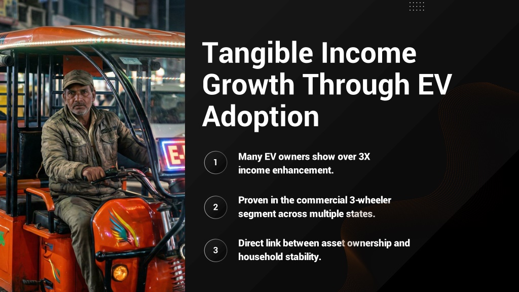 1 2 3 Tangible Income Growth Through EV Adoption Many EV owners show over 3X income enhancement. Proven in the commercial 3-wheeler segment across multiple states. Direct link between asset ownership and household stability.