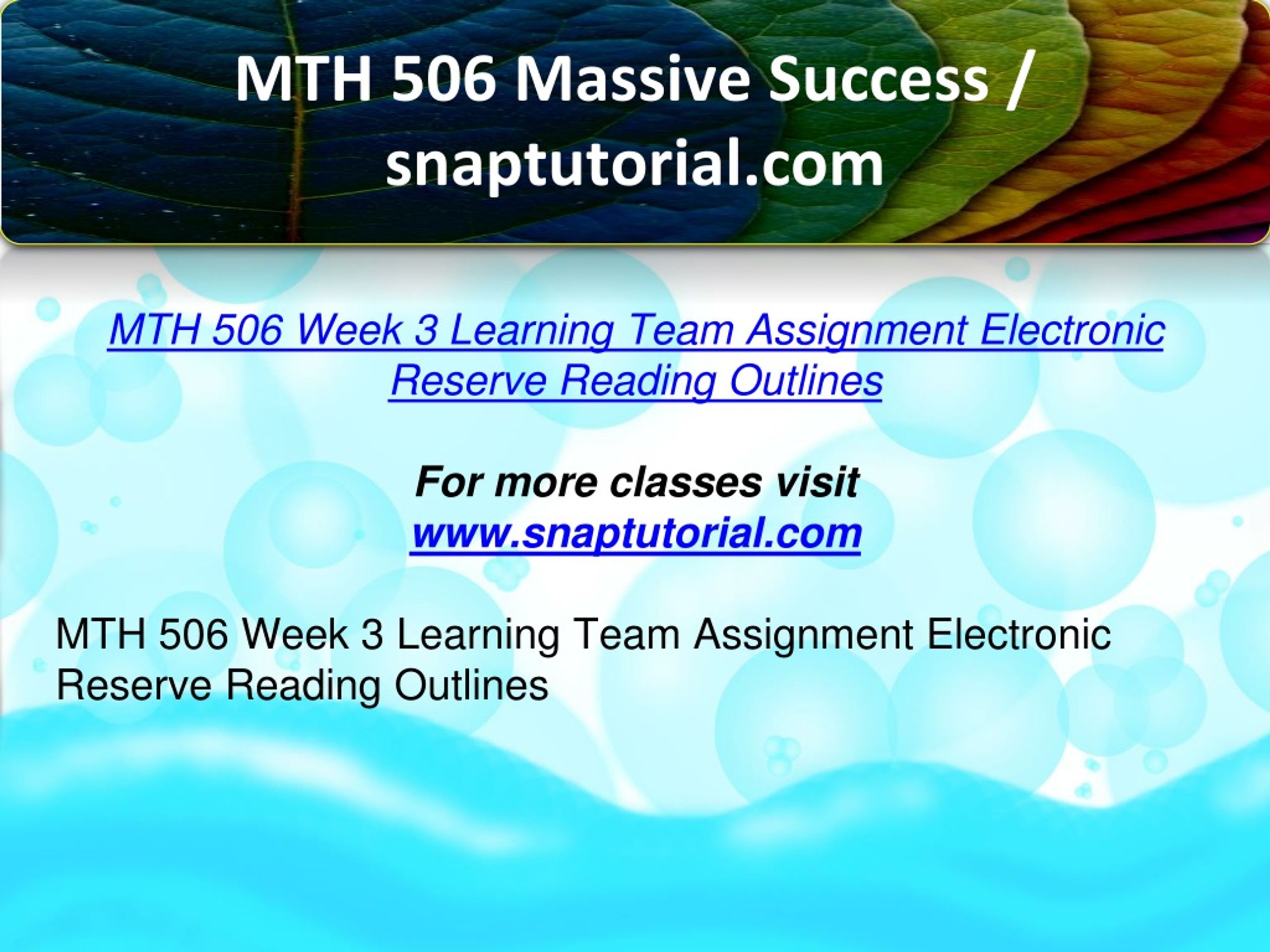 MTH 506 Massive Success / snaptutorial.com MTH 506 Week 3 Learning Team Assignment Electronic Reserve Reading Outlines For more classes visit www.snaptutorial.com MTH 506 Week 3 Learning Team Assignment Electronic Reserve Reading Outlines