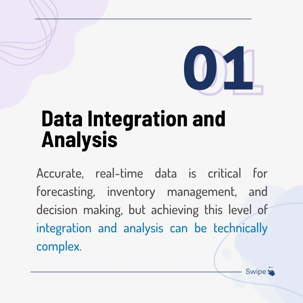01 01 Data Integration and Analysis Accurate, real-time data is critical for forecasting, inventory management, and decision making, but achieving this level of integration and analysis can be technically complex. Swipe