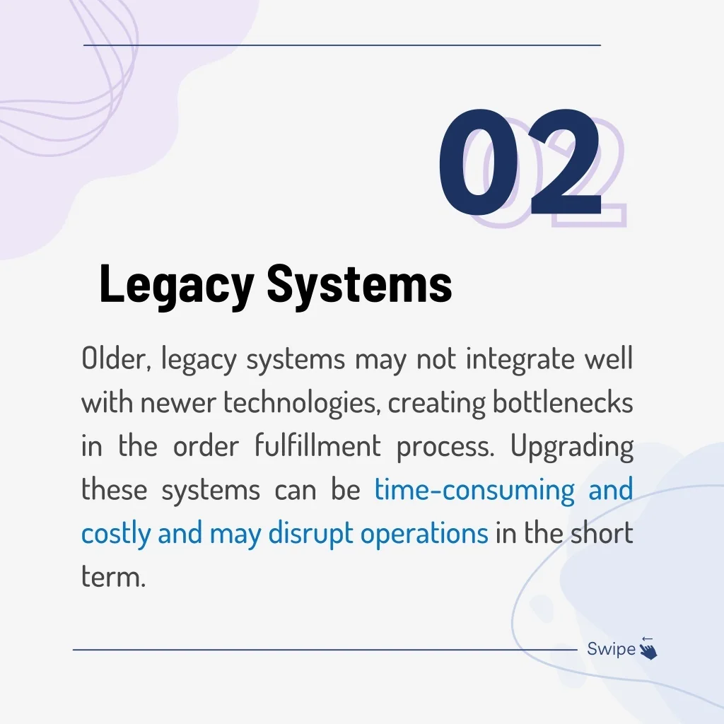 02 02 Legacy Systems Older, legacy systems may not integrate well with newer technologies, creating bottlenecks in the order fulfillment process. Upgrading these systems can be time-consuming and costly and may disrupt operations in the short term. Swipe