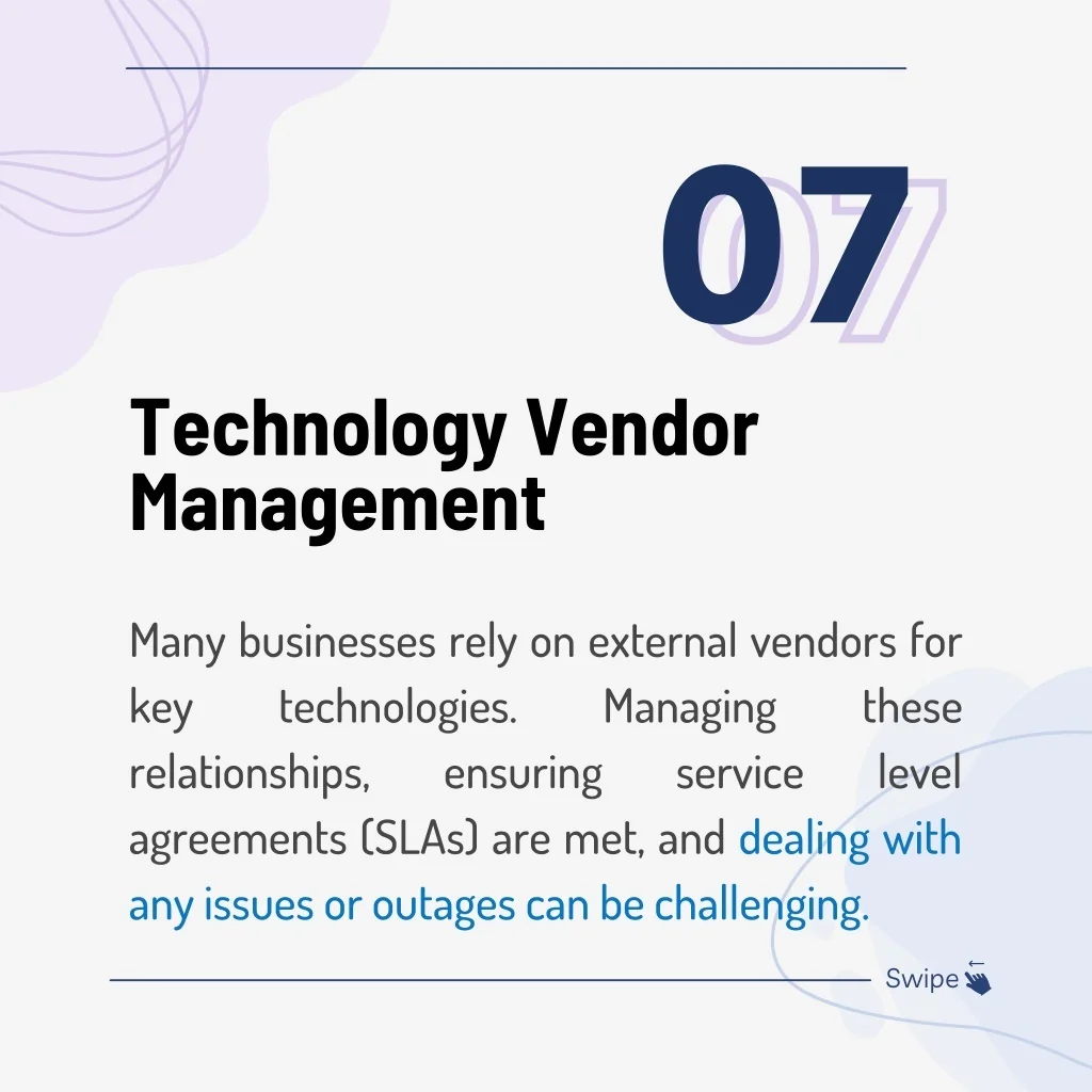 07 07 Technology Vendor Management Many businesses rely on external vendors for key technologies. relationships, ensuring agreements (SLAs) are met, and dealing with any issues or outages can be challenging. Managing service these level Swipe