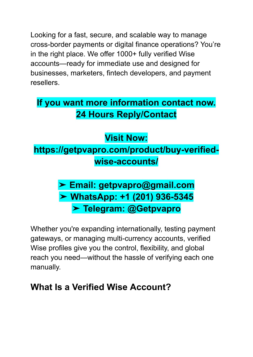 Looking for a fast, secure, and scalable way to manage cross-border payments or digital finance operations? You’re in the right place. We offer 1000+ fully verified Wise accounts—ready for immediate use and designed for businesses, marketers, fintech developers, and payment resellers. If you want more information contact now. 24 Hours Reply/Contact Visit Now: https://getpvapro.com/product/buy-verified- wise-accounts/ ➤ Email: getpvapro@gmail.com ➤ WhatsApp: +1 (201) 936-5345 ➤ Telegram: @Getpvapro Whether you're expanding internationally, testing payment gateways, or managing multi-currency accounts, verified Wise profiles give you the control, flexibility, and global reach you need—without the hassle of verifying each one manually. What Is a Verified Wise Account?