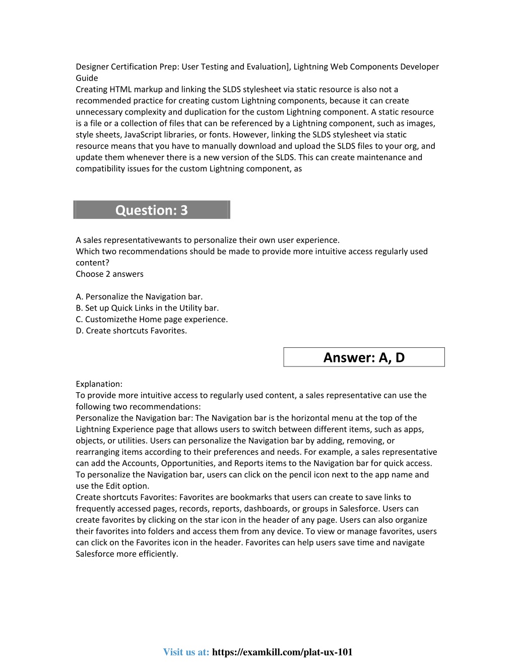 Designer Certification Prep: User Testing and Evaluation], Lightning Web Components Developer Guide Creating HTML markup and linking the SLDS stylesheet via static resource is also not a recommended practice for creating custom Lightning components, because it can create unnecessary complexity and duplication for the custom Lightning component. A static resource is a file or a collection of files that can be referenced by a Lightning component, such as images, style sheets, JavaScript libraries, or fonts. However, linking the SLDS stylesheet via static resource means that you have to manually download and upload the SLDS files to your org, and update them whenever there is a new version of the SLDS. This can create maintenance and compatibility issues for the custom Lightning component, as Question: 3 A sales representativewants to personalize their own user experience. Which two recommendations should be made to provide more intuitive access regularly used content? Choose 2 answers A. Personalize the Navigation bar. B. Set up Quick Links in the Utility bar. C. Customizethe Home page experience. D. Create shortcuts Favorites. Answer: A, D Explanation: To provide more intuitive access to regularly used content, a sales representative can use the following two recommendations: Personalize the Navigation bar: The Navigation bar is the horizontal menu at the top of the Lightning Experience page that allows users to switch between different items, such as apps, objects, or utilities. Users can personalize the Navigation bar by adding, removing, or rearranging items according to their preferences and needs. For example, a sales representative can add the Accounts, Opportunities, and Reports items to the Navigation bar for quick access. To personalize the Navigation bar, users can click on the pencil icon next to the app name and use the Edit option. Create shortcuts Favorites: Favorites are bookmarks that users can create to save links to frequently accessed pages, records, reports, dashboards, or groups in Salesforce. Users can create favorites by clicking on the star icon in the header of any page. Users can also organize their favorites into folders and access them from any device. To view or manage favorites, users can click on the Favorites icon in the header. Favorites can help users save time and navigate Salesforce more efficiently. Visit us at: https://examkill.com/plat-ux-101