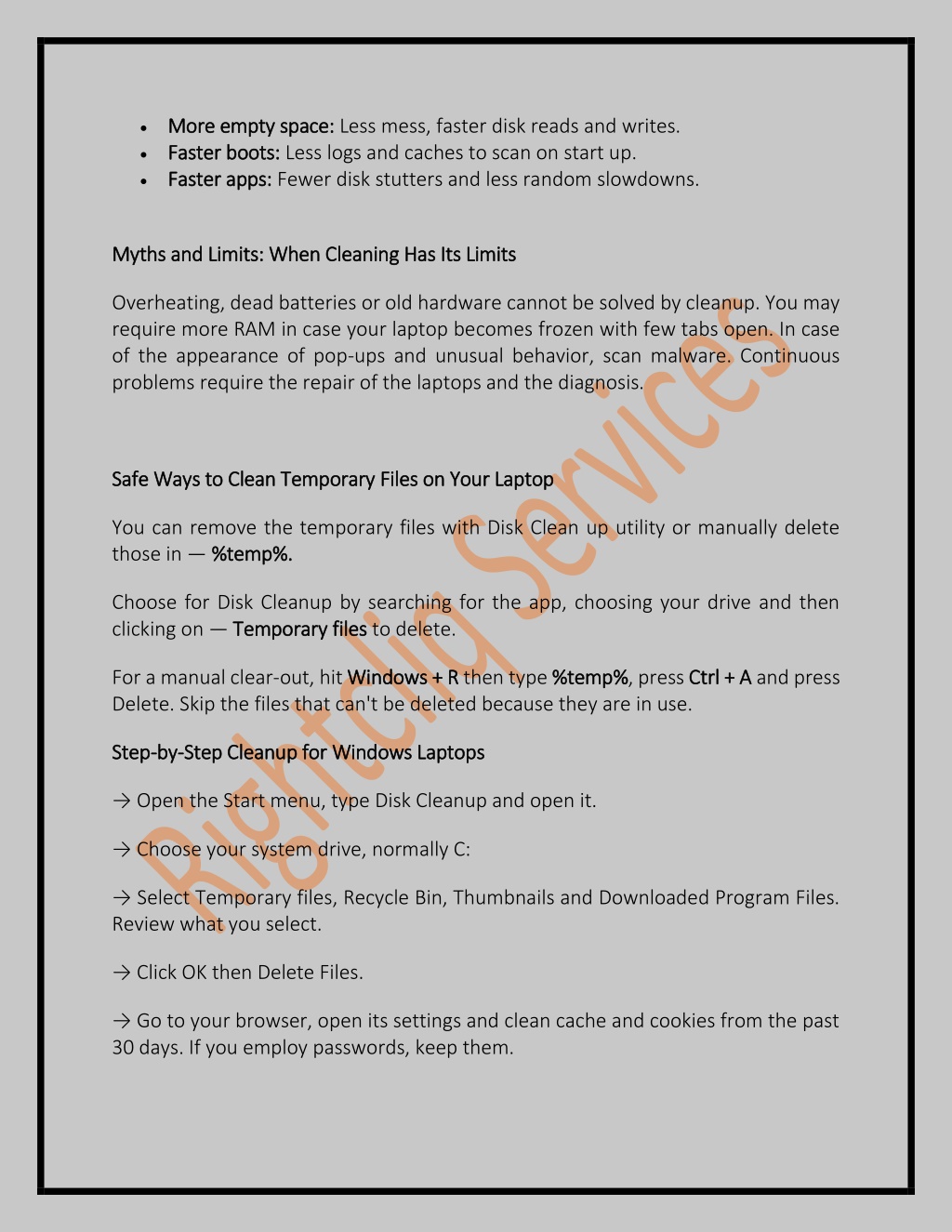•More empty space: More empty space: Less mess, faster disk reads and writes. •Faster boots: Faster boots: Less logs and caches to scan on start up. •Faster apps: Faster apps: Fewer disk stutters and less random slowdowns. Myths and Limits: When Cleaning Has Its Limits Myths and Limits: When Cleaning Has Its Limits Overheating, dead batteries or old hardware cannot be solved by cleanup. You may require more RAM in case your laptop becomes frozen with few tabs open. In case of the appearance of pop-ups and unusual behavior, scan malware. Continuous problems require the repair of the laptops and the diagnosis. Safe Ways to Clean Temporary Files on Your Laptop Safe Ways to Clean Temporary Files on Your Laptop You can remove the temporary files with Disk Clean up utility or manually delete those in — %temp%. %temp%. Choose for Disk Cleanup by searching for the app, choosing your drive and then clicking on — Temporary files Temporary files to delete. For a manual clear-out, hit Windows + R Delete. Skip the files that can't be deleted because they are in use. Windows + R then type %temp% %temp%, press Ctrl + A Ctrl + A and press Step Step- -by by- -Step Cleanup for Windows Laptops Step Cleanup for Windows Laptops → Open the Start menu, type Disk Cleanup and open it. → Choose your system drive, normally C: → Select Temporary files, Recycle Bin, Thumbnails and Downloaded Program Files. Review what you select. → Click OK then Delete Files. → Go to your browser, open its settings and clean cache and cookies from the past 30 days. If you employ passwords, keep them.
