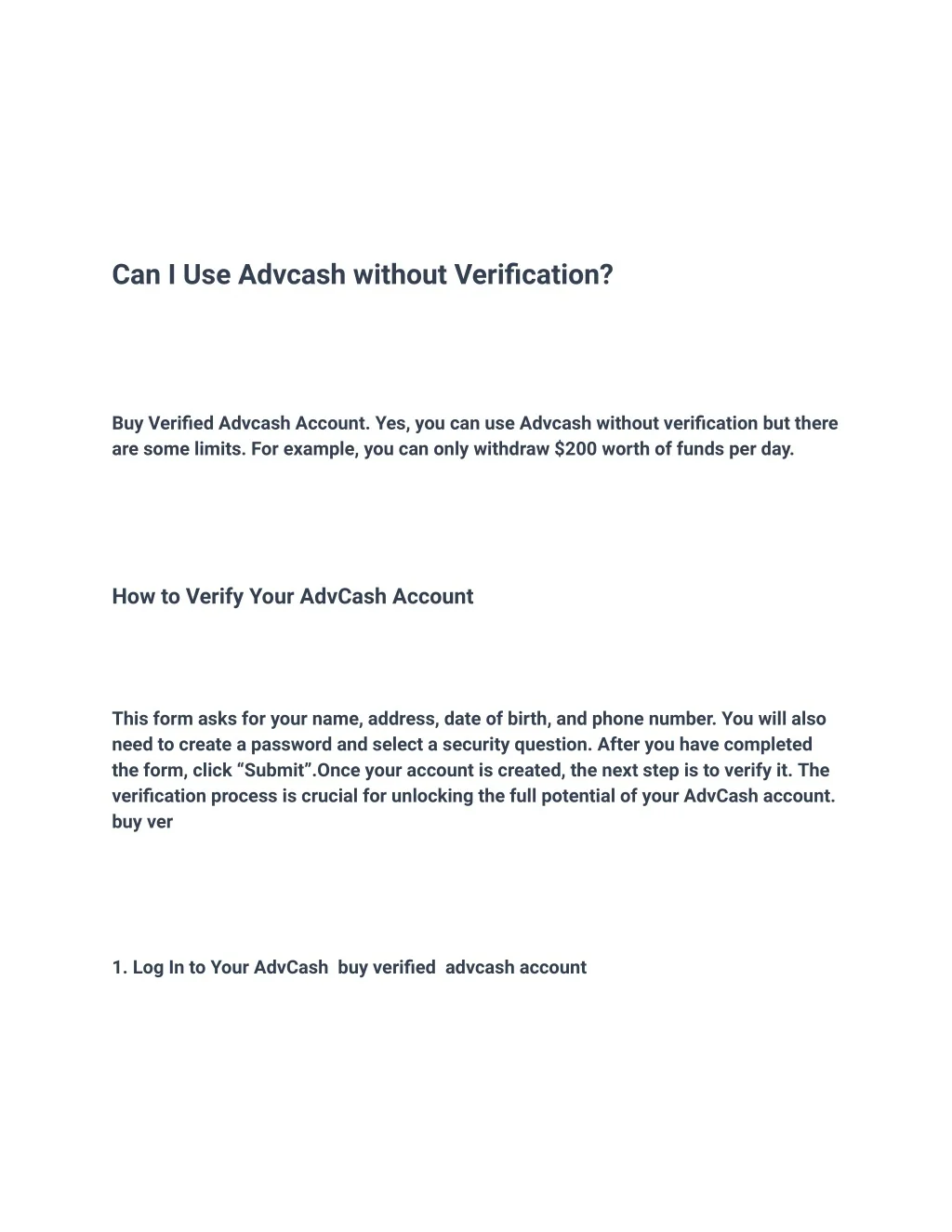 Can I Use Advcash without Verification? Buy Verified Advcash Account. Yes, you can use Advcash without verification but there are some limits. For example, you can only withdraw $200 worth of funds per day. How to Verify Your AdvCash Account This form asks for your name, address, date of birth, and phone number. You will also need to create a password and select a security question. After you have completed the form, click “Submit”.Once your account is created, the next step is to verify it. The verification process is crucial for unlocking the full potential of your AdvCash account. buy ver 1. Log In to Your AdvCash buy verified advcash account