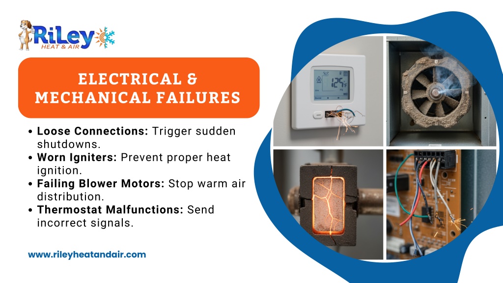 4. ELECTRICAL & MECHANICAL FAILURES Loose Connections: Trigger sudden shutdowns. Worn Igniters: Prevent proper heat ignition. Failing Blower Motors: Stop warm air distribution. Thermostat Malfunctions: Send incorrect signals. www.rileyheatandair.com