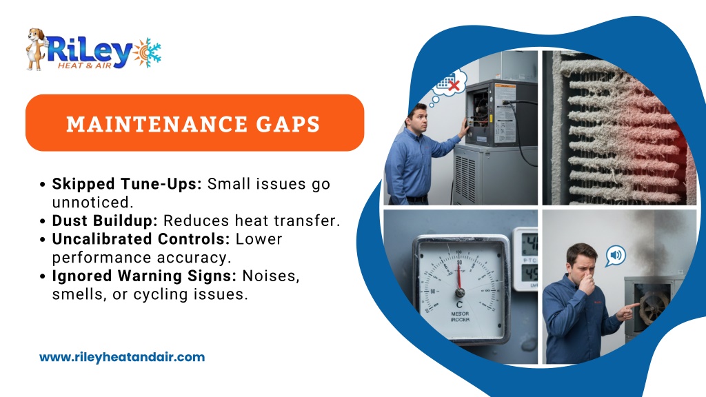 5. MAINTENANCE GAPS Skipped Tune-Ups: Small issues go unnoticed. Dust Buildup: Reduces heat transfer. Uncalibrated Controls: Lower performance accuracy. Ignored Warning Signs: Noises, smells, or cycling issues. www.rileyheatandair.com