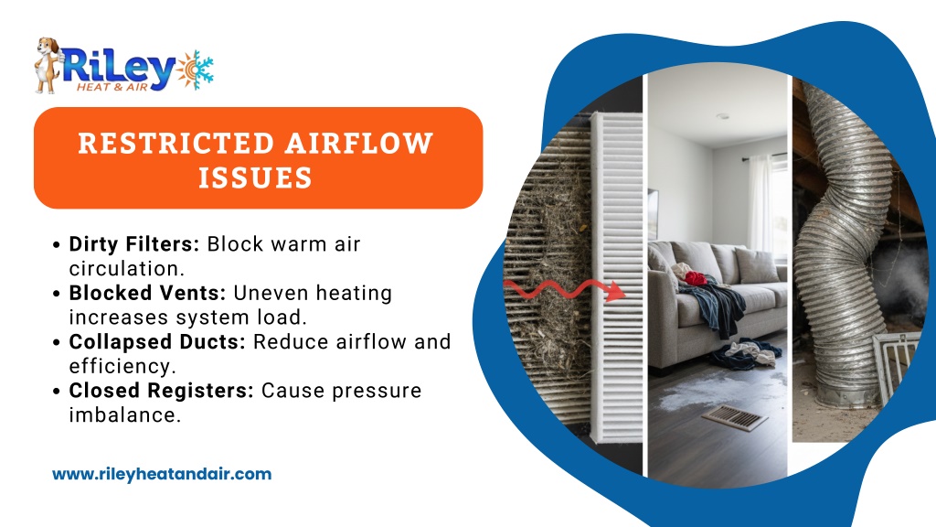 3. RESTRICTED AIRFLOW ISSUES Dirty Filters: Block warm air circulation. Blocked Vents: Uneven heating increases system load. Collapsed Ducts: Reduce airflow and efficiency. Closed Registers: Cause pressure imbalance. www.rileyheatandair.com