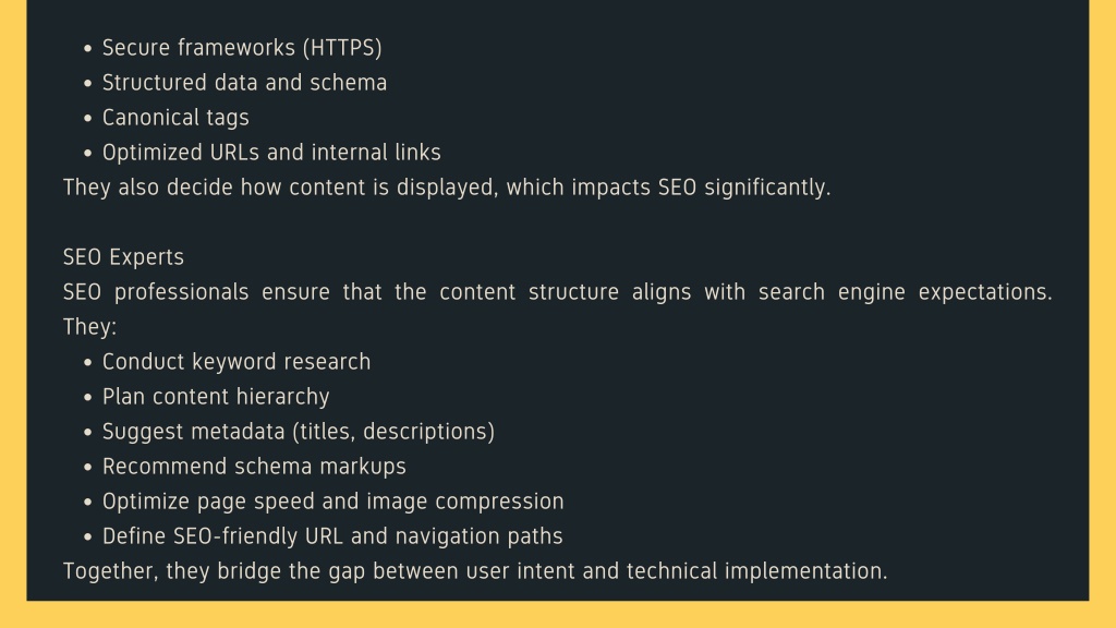 6. Secure frameworks (HTTPS) Structured data and schema Canonical tags Optimized URLs and internal links They also decide how content is displayed, which impacts SEO significantly. SEO Experts SEO professionals ensure that the content structure aligns with search engine expectations. They: Conduct keyword research Plan content hierarchy Suggest metadata (titles, descriptions) Recommend schema markups Optimize page speed and image compression Define SEO-friendly URL and navigation paths Together, they bridge the gap between user intent and technical implementation.