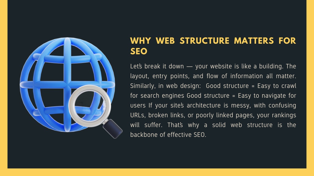 3. WHY WEB STRUCTURE MATTERS FOR SEO Let’ s break it down — your website is like a building. The layout, entry points, and flow of information all matter. Similarly, in web design: Good structure = Easy to crawl for search engines Good structure = Easy to navigate for users If your site’ s architecture is messy, with confusing URLs, broken links, or poorly linked pages, your rankings will suffer. That’ s why a solid web structure is the backbone of effective SEO.