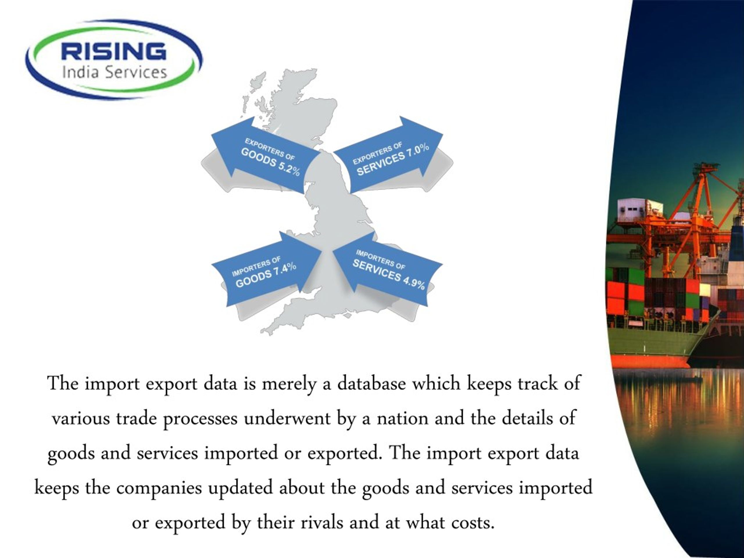 The import export data is merely a database which keeps track of various trade processes underwent by a nation and the details of goods and services imported or exported. The import export data keeps the companies updated about the goods and services imported or exported by their rivals and at what costs.
