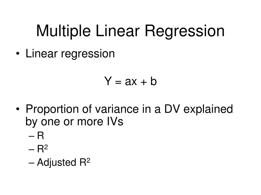 Multiple Linear Regression • Linear regression Y = ax + b • Proportion of variance in a DV explained by one or more IVs • R • R2 • Adjusted R2