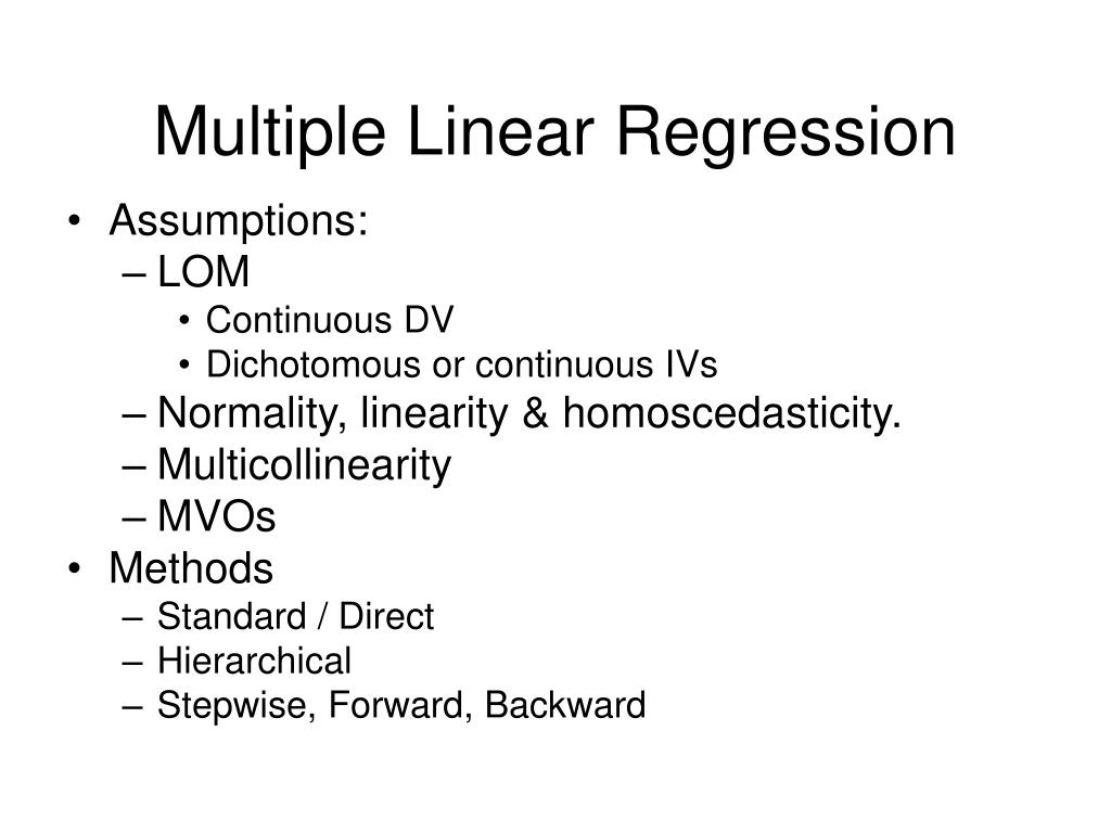 Multiple Linear Regression • Assumptions: • LOM • Continuous DV • Dichotomous or continuous IVs • Normality, linearity & homoscedasticity. • Multicollinearity • MVOs • Methods • Standard / Direct • Hierarchical • Stepwise, Forward, Backward