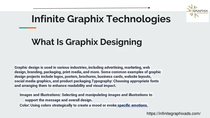Infinite Graphix Technologies What Is Graphix Designing Graphic design is used in various industries, including advertising, marketing, web design, branding, packaging, print media, and more. Some common examples of graphic design projects include logos, posters, brochures, business cards, website layouts, social media graphics, and product packaging.Typography: Choosing appropriate fonts and arranging them to enhance readability and visual impact. Images and Illustrations: Selecting and manipulating images and illustrations to support the message and overall design. Color: Using colors strategically to create a mood or evoke specific emotions. https://infinitegraphixads.com/