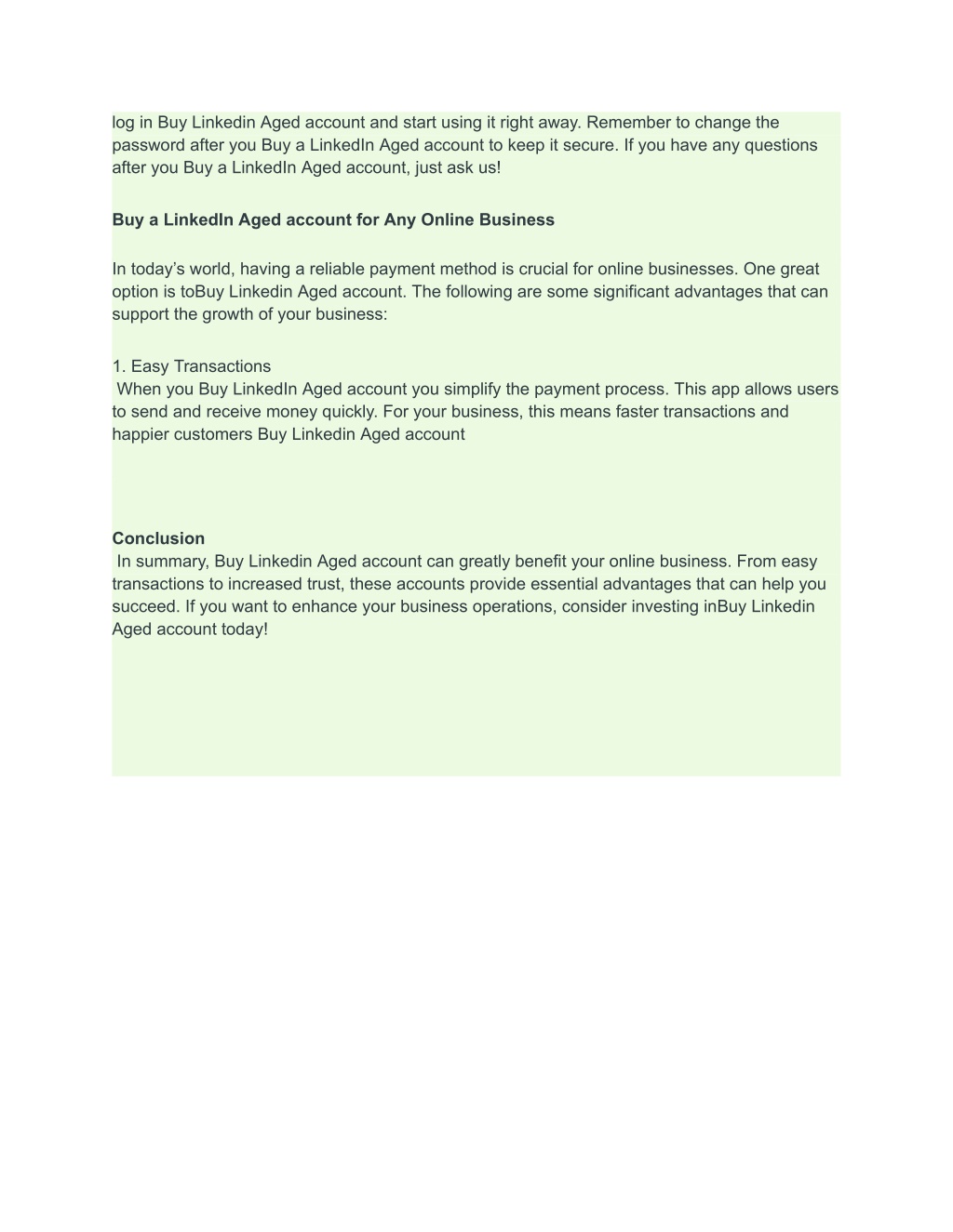 log in Buy Linkedin Aged account and start using it right away. Remember to change the password after you Buy a LinkedIn Aged account to keep it secure. If you have any questions after you Buy a LinkedIn Aged account, just ask us! Buy a LinkedIn Aged account for Any Online Business In today’s world, having a reliable payment method is crucial for online businesses. One great option is toBuy Linkedin Aged account. The following are some significant advantages that can support the growth of your business: 1. Easy Transactions When you Buy LinkedIn Aged account you simplify the payment process. This app allows users to send and receive money quickly. For your business, this means faster transactions and happier customers Buy Linkedin Aged account Conclusion In summary, Buy Linkedin Aged account can greatly benefit your online business. From easy transactions to increased trust, these accounts provide essential advantages that can help you succeed. If you want to enhance your business operations, consider investing inBuy Linkedin Aged account today!