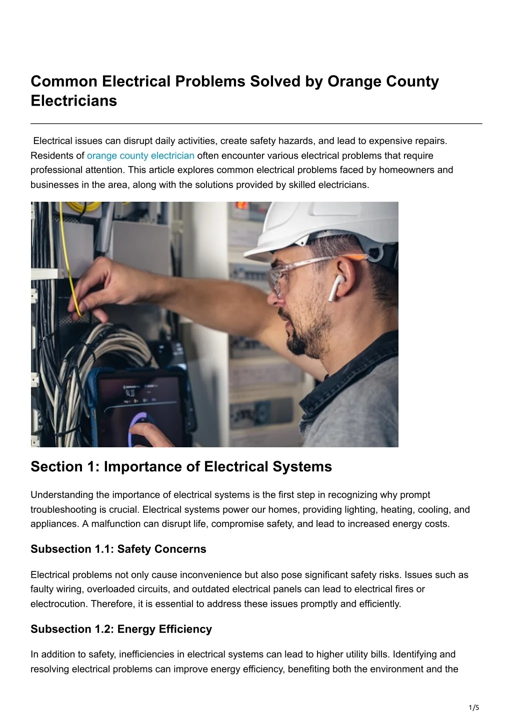 Common Electrical Problems Solved by Orange County Electricians Electrical issues can disrupt daily activities, create safety hazards, and lead to expensive repairs. Residents of orange county electrician often encounter various electrical problems that require professional attention. This article explores common electrical problems faced by homeowners and businesses in the area, along with the solutions provided by skilled electricians. Section 1: Importance of Electrical Systems Understanding the importance of electrical systems is the first step in recognizing why prompt troubleshooting is crucial. Electrical systems power our homes, providing lighting, heating, cooling, and appliances. A malfunction can disrupt life, compromise safety, and lead to increased energy costs. Subsection 1.1: Safety Concerns Electrical problems not only cause inconvenience but also pose significant safety risks. Issues such as faulty wiring, overloaded circuits, and outdated electrical panels can lead to electrical fires or electrocution. Therefore, it is essential to address these issues promptly and efficiently. Subsection 1.2: Energy Efficiency In addition to safety, inefficiencies in electrical systems can lead to higher utility bills. Identifying and resolving electrical problems can improve energy efficiency, benefiting both the environment and the 1/5