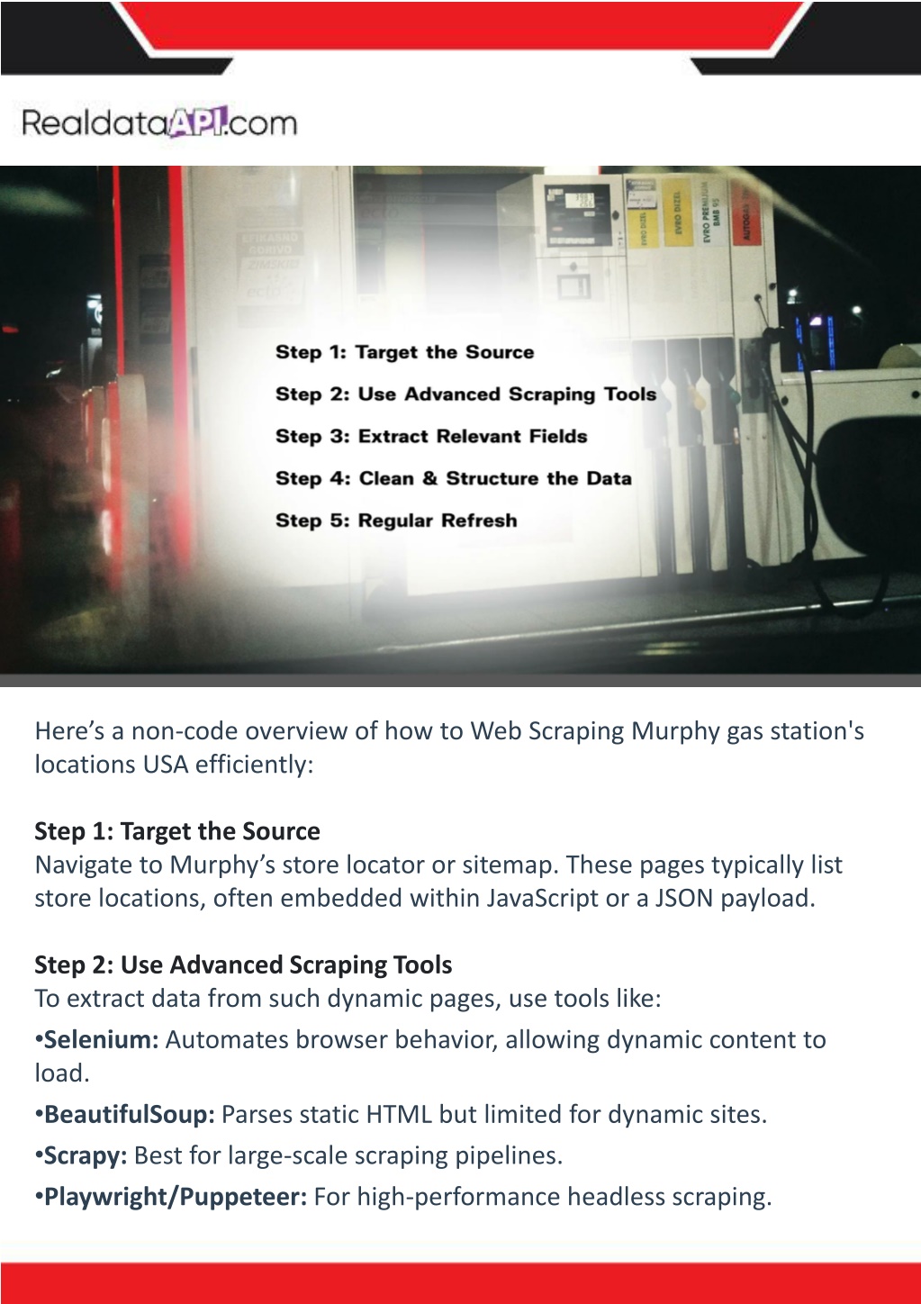 How to Scrape Murphy Gas Station Locations USA for Retail Expansion Analysis? Introduction As the fuel retail landscape grows increasingly competitive, businesses and analysts need to leverage precise location data to guide strategic expansion. Murphy USA, one of the leading fuel retailers in the United States, operates thousands of stations, primarily near Walmart stores. Gaining access to comprehensive and accurate Murphy gas station locations can provide invaluable insights into market saturation, growth opportunities, and competition analysis. In this guide, we explore how to Scrape Murphy gas station locations USA and turn raw location data into a powerful asset for retail expansion planning. We also walk you through how Real Data API simplifies this process with automation, real-time updates, and scalable data delivery.