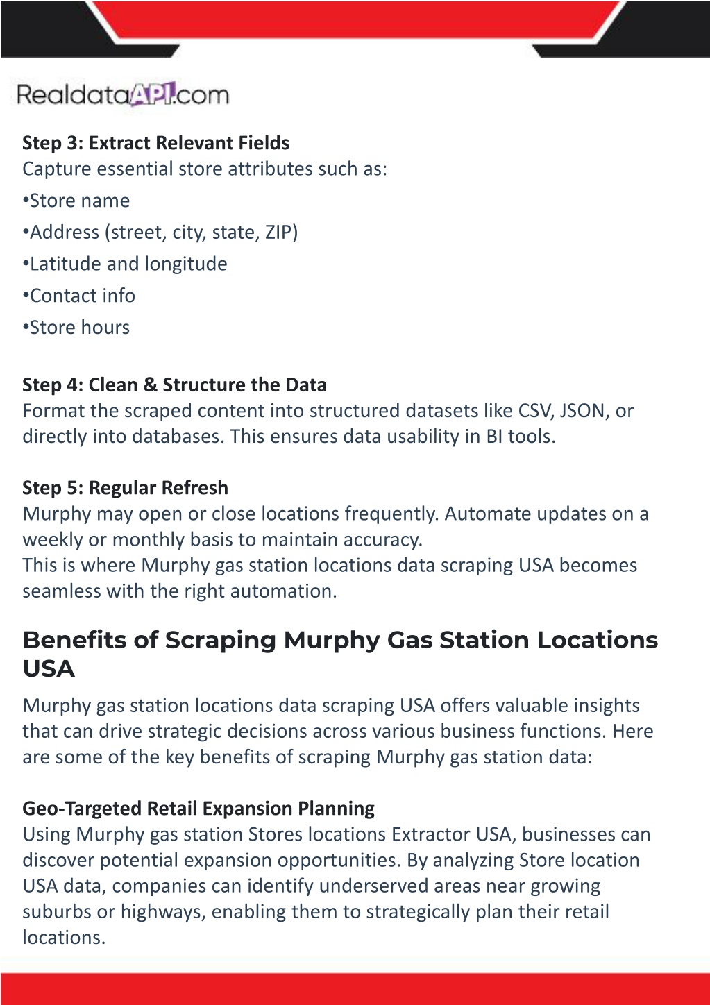 Step 3: Extract Relevant Fields Capture essential store attributes such as: • Store name • Address (street, city, state, ZIP) • Latitude and longitude • Contact info • Store hours Step 4: Clean & Structure the Data Format the scraped content into structured datasets like CSV, JSON, or directly into databases. This ensures data usability in BI tools. Step 5: Regular Refresh Murphy may open or close locations frequently. Automate updates on a weekly or monthly basis to maintain accuracy. • This is where Murphy gas station locations data scraping USA becomes seamless with the right automation. Benefits of Scraping Murphy Gas Station Locations USA Murphy gas station locations data scraping USA offers valuable insights that can drive strategic decisions across various business functions. Here are some of the key benefits of scraping Murphy gas station data: Geo-Targeted Retail Expansion Planning Using Murphy gas station Stores locations Extractor USA, businesses can discover potential expansion opportunities. By analyzing Store location USA data, companies can identify underserved areas near growing suburbs or highways, enabling them to strategically plan their retail locations.