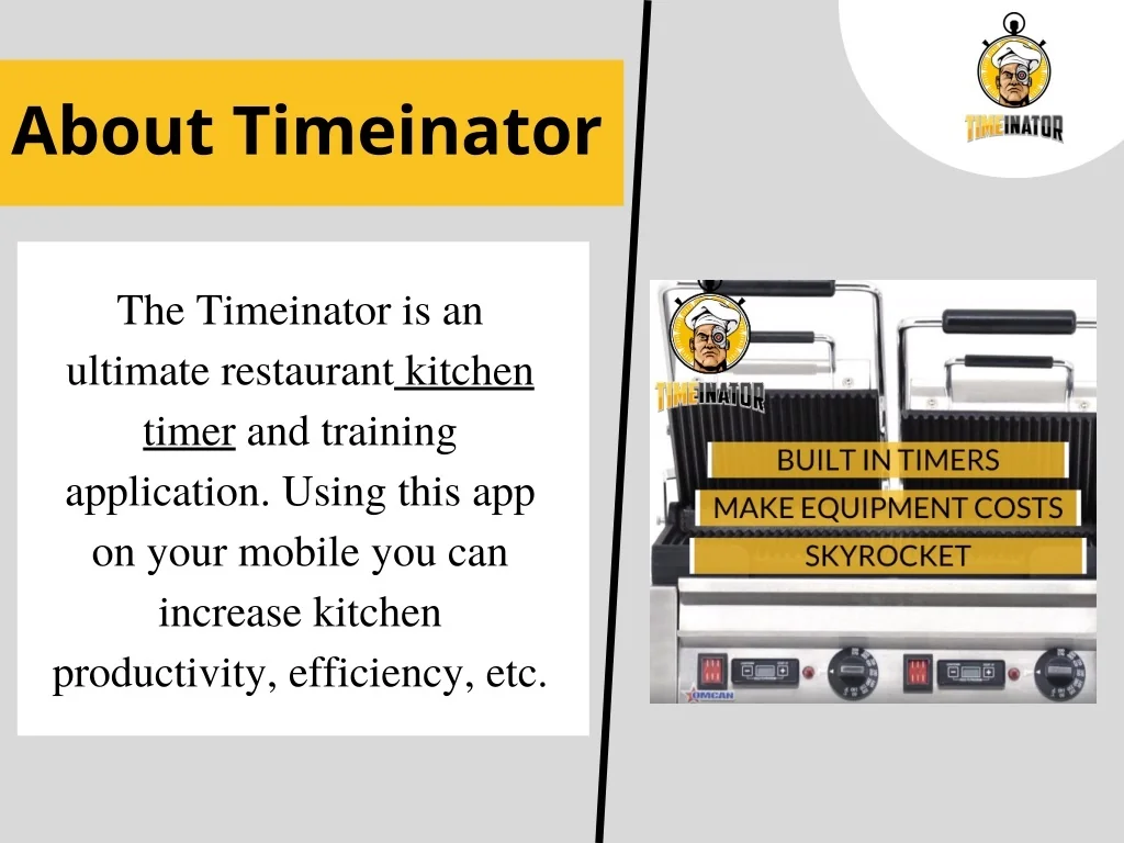 About Timeinator The Timeinator is an ultimate restaurant kitchen timer and training application. Using this app on your mobile you can increase kitchen productivity, efficiency, etc.